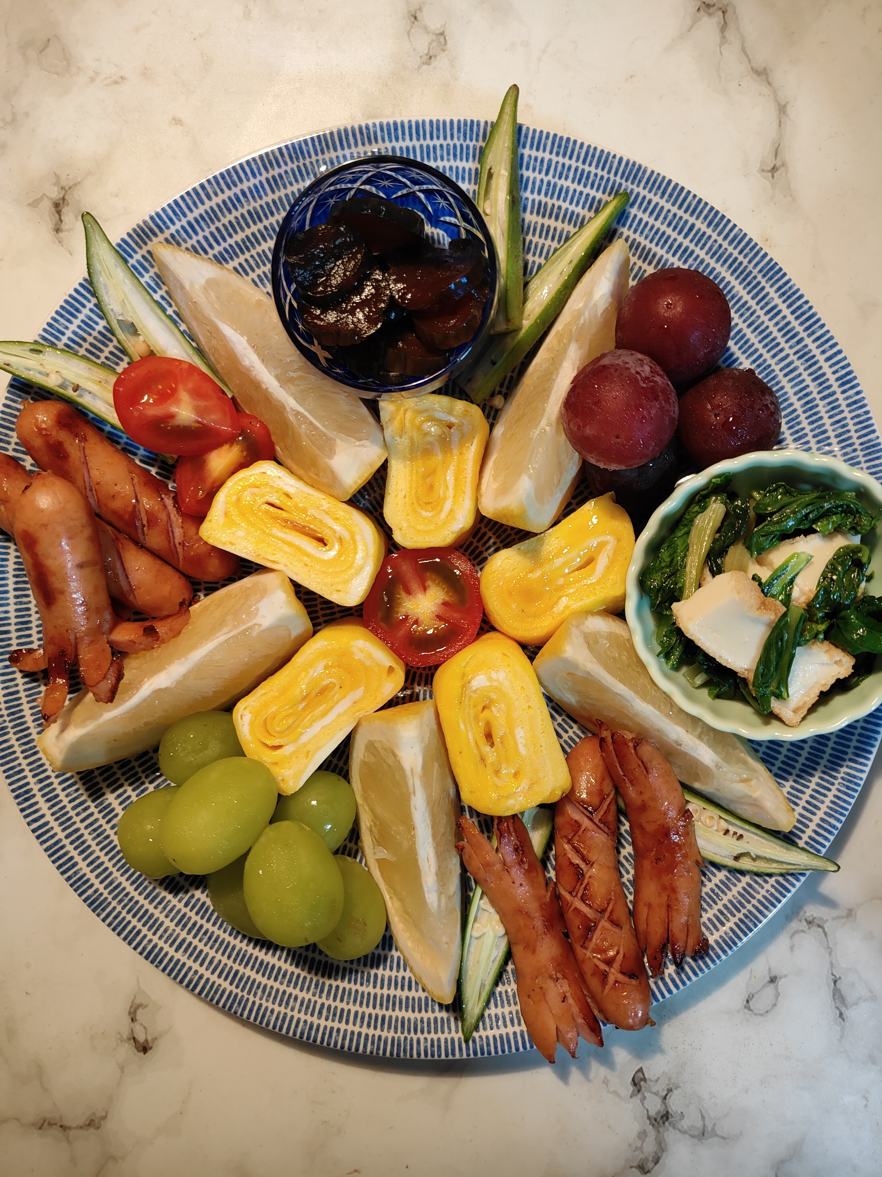 あとは…フルーツ🍊🍇💚とプチトマト🍅にオクラ…あるもので…好きな物で…盛り付けを楽しみました♪