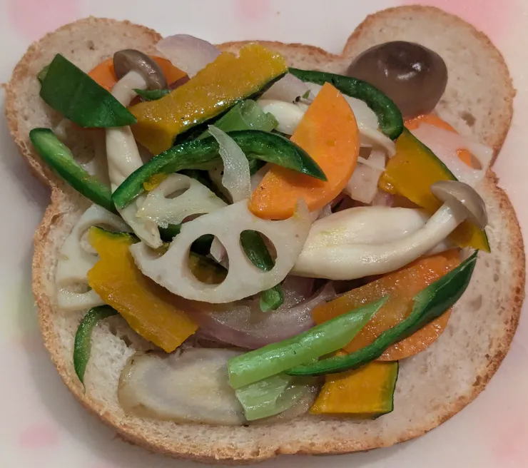 投稿を表示お手製くま食パンに、たっぷりお野菜♡