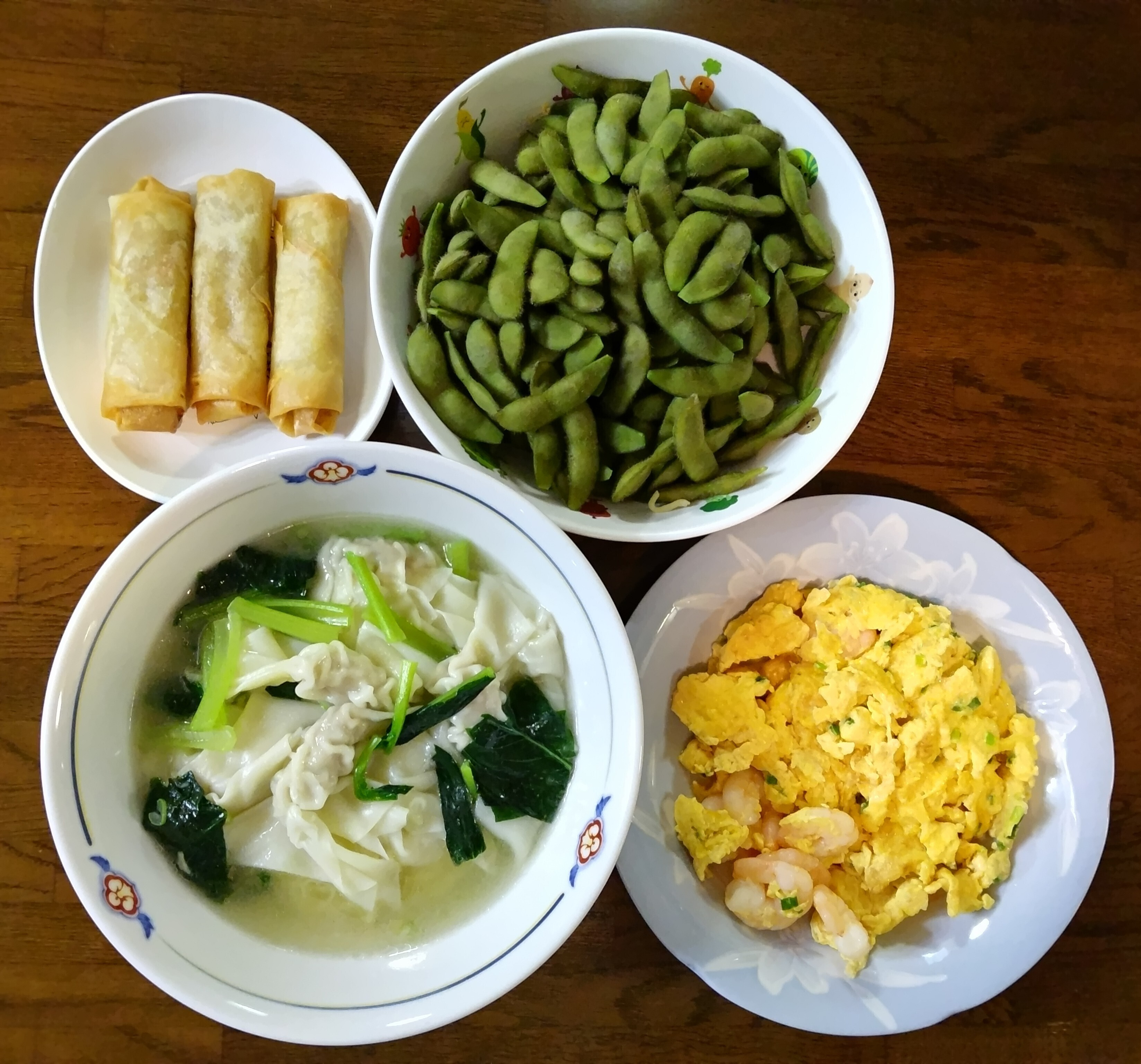 夕食はワンタンメン、春巻き、エビとたまごの炒めものでした