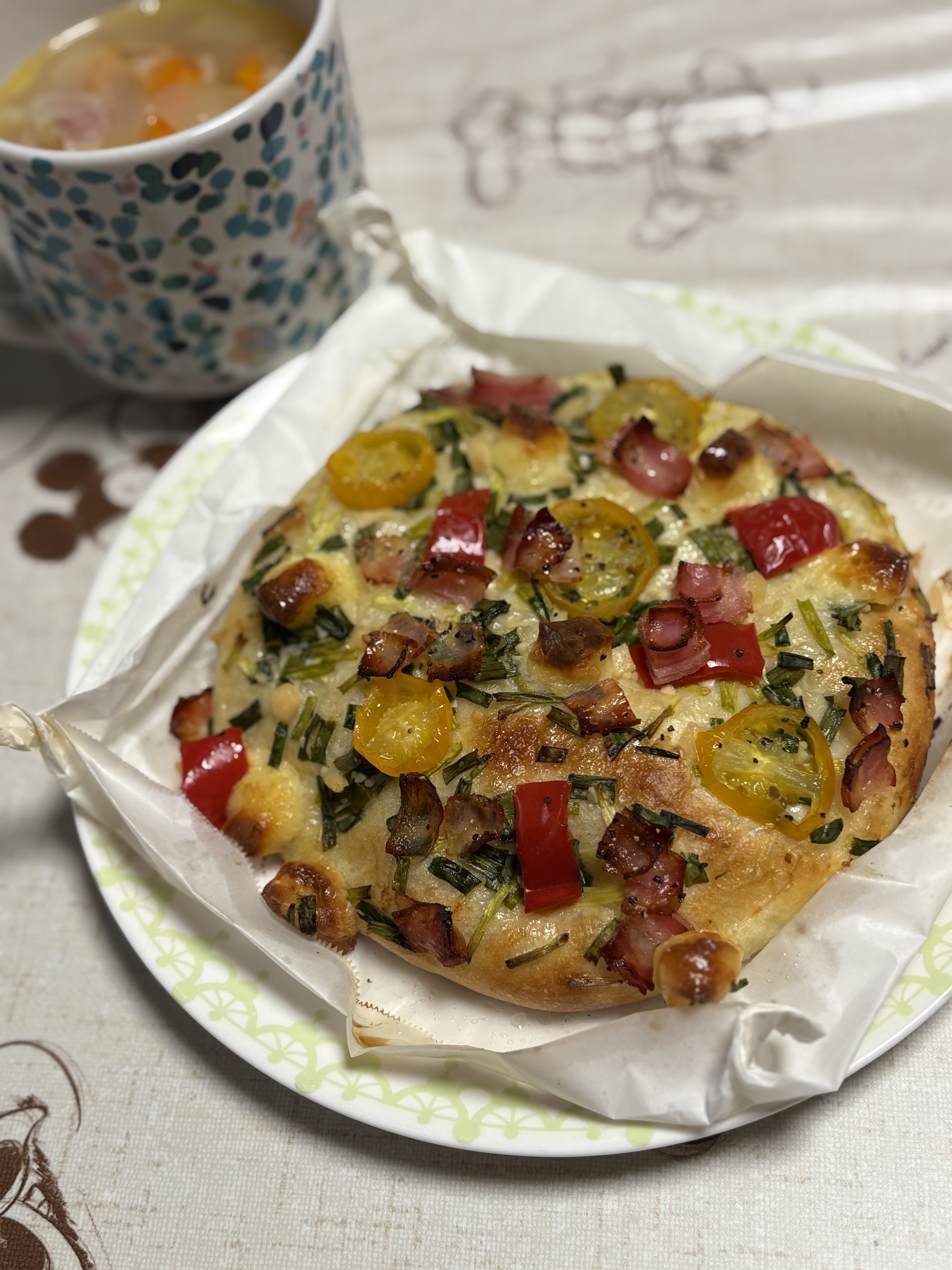 生地にマヨを塗って細ネギ、ニンニク、ミニトマト(黄)、赤パプリカ、ベーコン🥓、モッツァレラチーズを乗せて焼きました。
