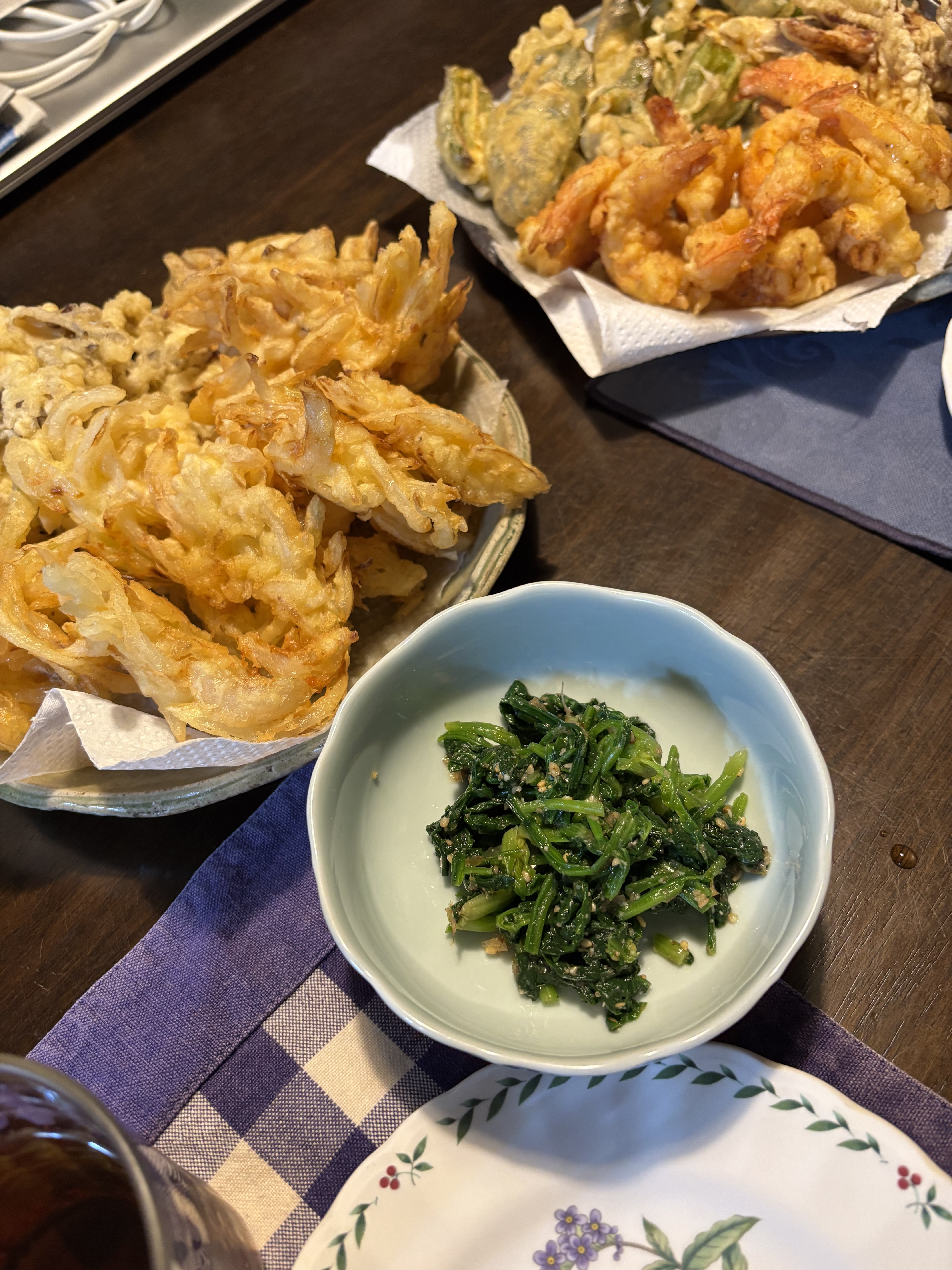 衣にマヨネーズを加えて、天ぷらを沢山作りました。カラッと揚がって嬉しい。具材を減らして使ってもいつも多い出来上がり😛