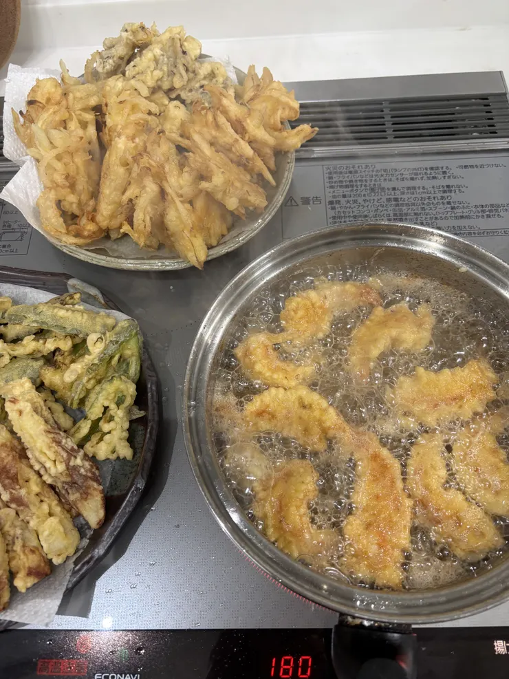 衣にマヨネーズを加えて、天ぷらを沢山作りました。カラッと揚がって嬉しい。具材を減らして使ってもいつも多い出来上がり😛