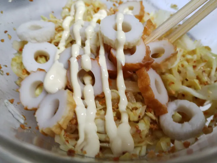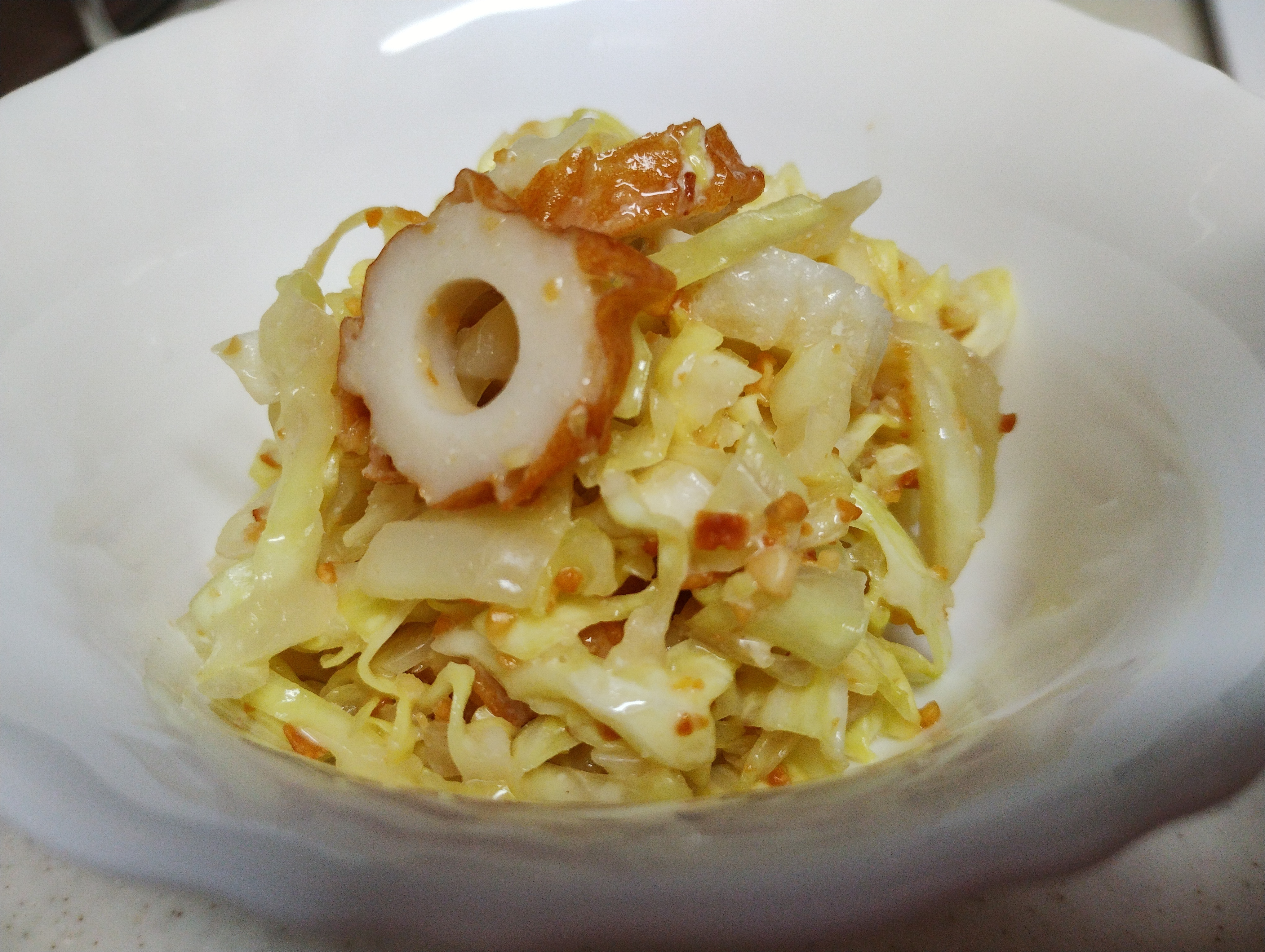 ◯レンチンした キャベツ + 竹輪 にキユーピー3分クッキングピーナッツ和えの素 + キユーピーハーフ で和え物を作りました
