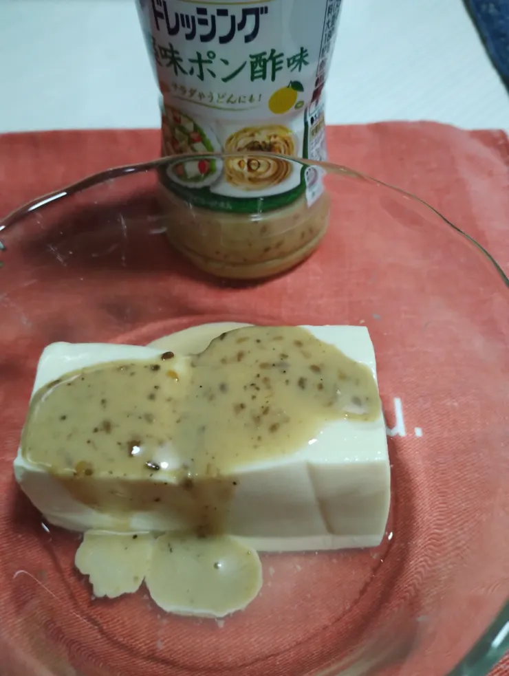 ◯湯豆腐に深煎りごまドレッシング 薬味ポン酢味を掛けて頂きました