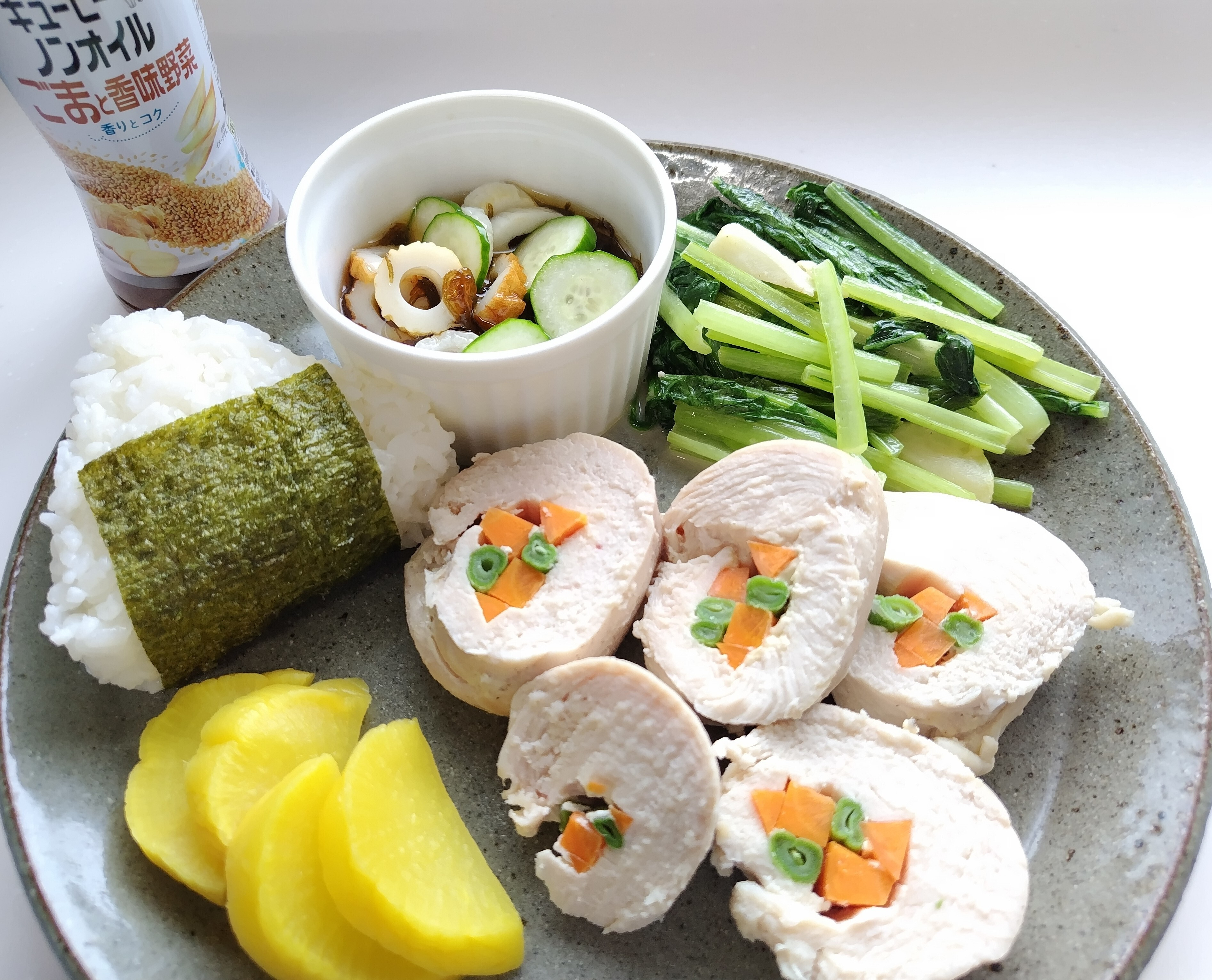 鶏むね肉に塩コショウしてマヨネーズまぶし人参といんげんを巻いて、酒をふりレンチンしてカット。ノンオイルごまと香味野菜のドレッシングかけて美味しく頂きました。