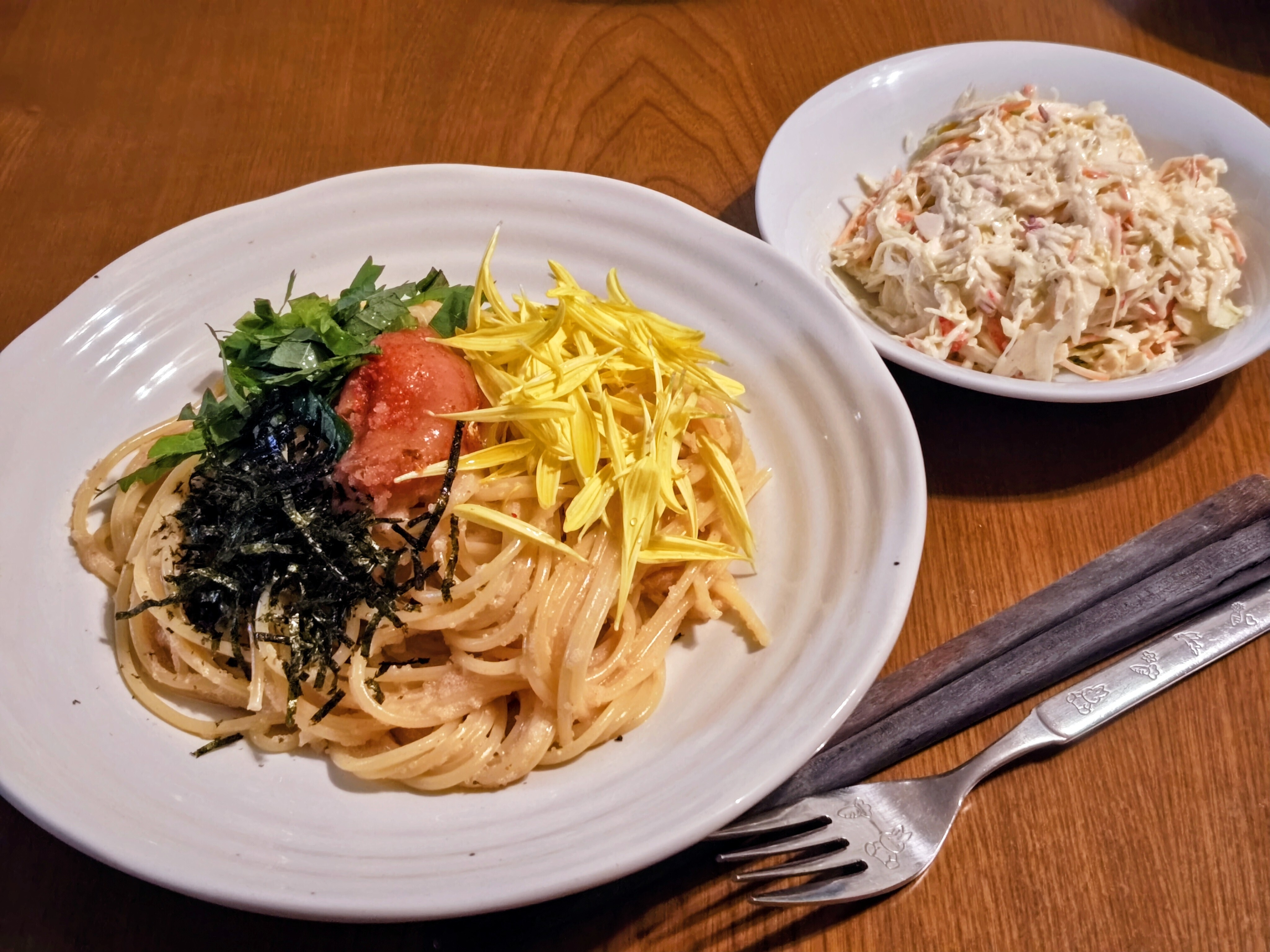 トッピングは、明太子、大葉、きざみ海苔、そして息子が買ってきた食用菊。