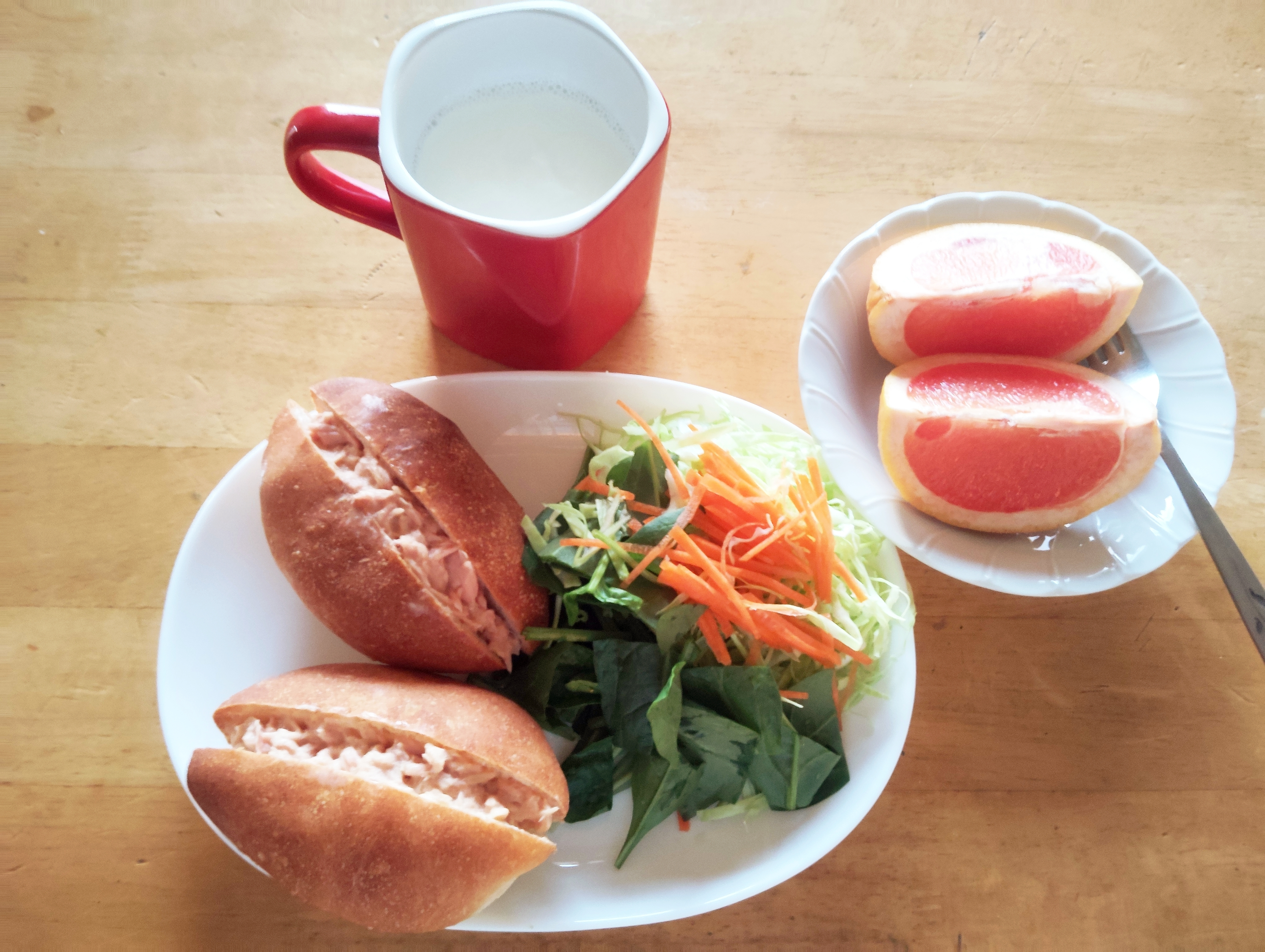 ツナサンド、ほうれん草とキャベツのサラダ、グレープフルーツ、ホットミルク