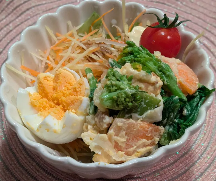 ポテトサラダと色鮮やかなお野菜、きれいに