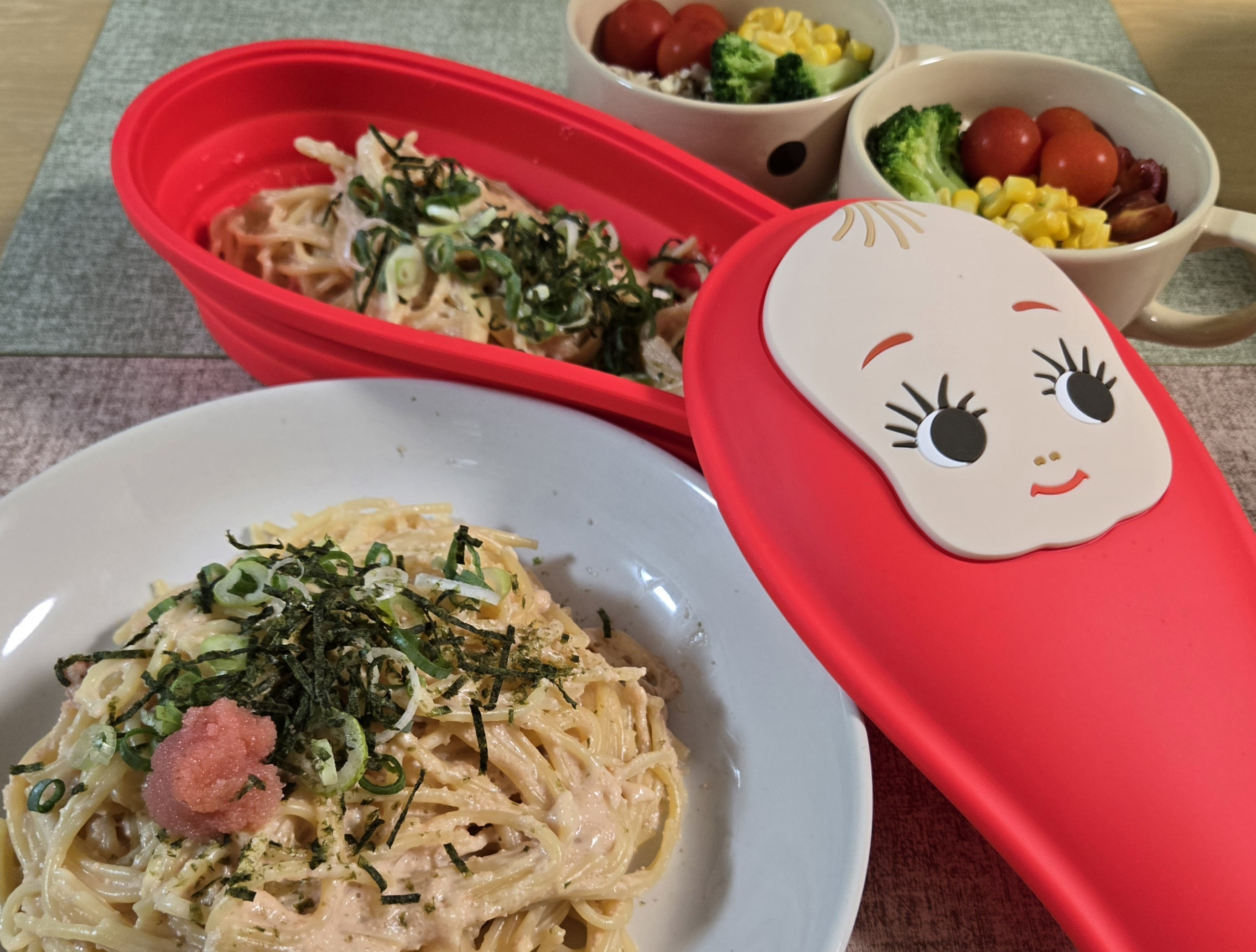 ずっと眠っていた😪たらこキューピーのシリコンスチーマーを使ってパスタを茹で、ソースはフライパンで牛乳、めんつゆ、マヨネーズ、バター、たらこを入れて作りました🍝
