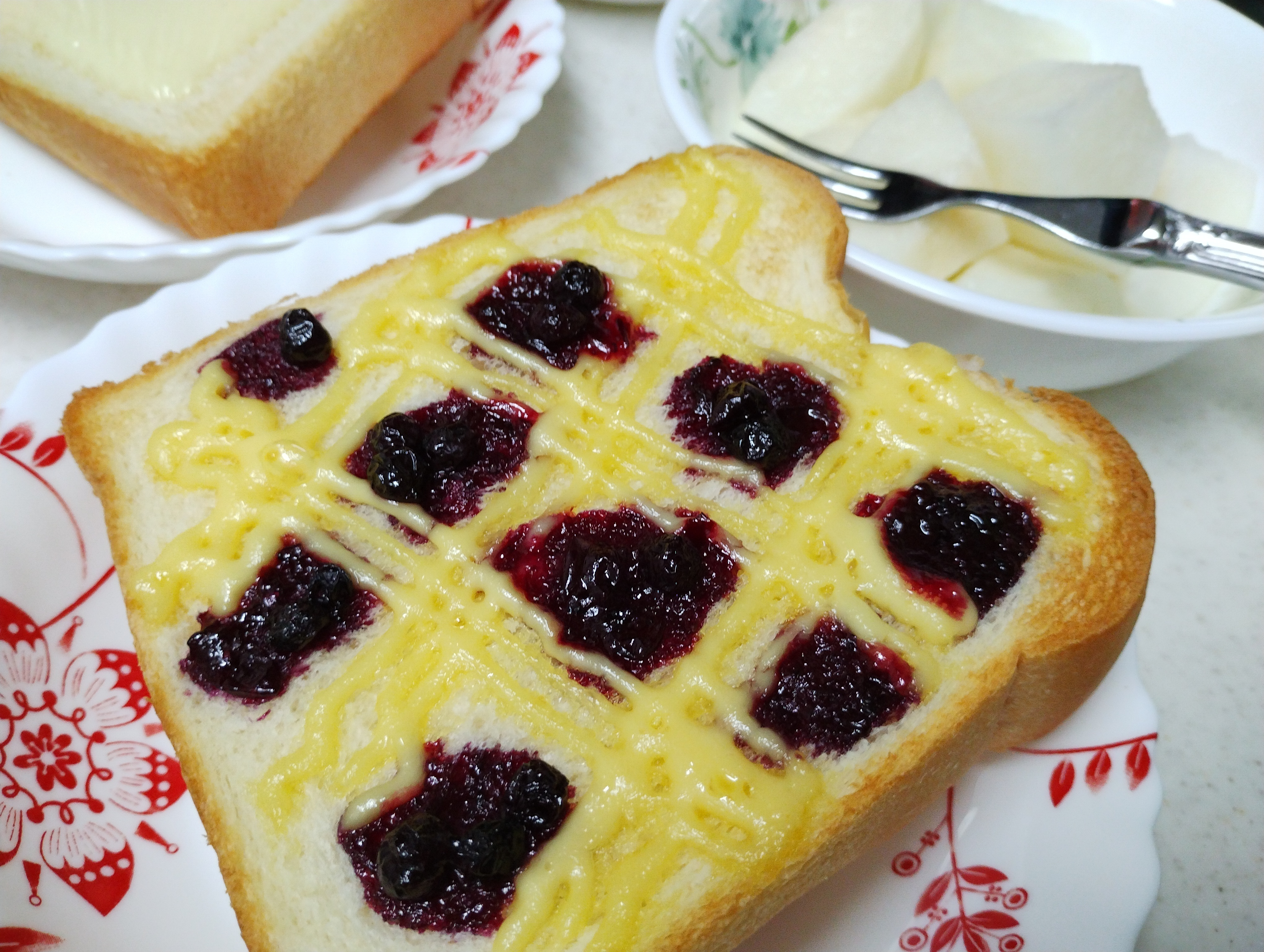 ◯食パンにブルーベリージャム+マヨネーズをかけてトーストしました