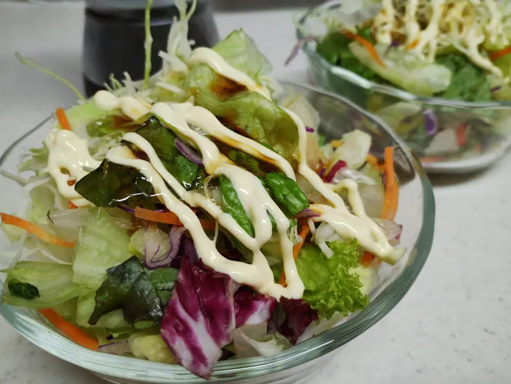 カット野菜にキユーピーハーフと和風醤油ごま入ドレッシングを掛けて頂きました