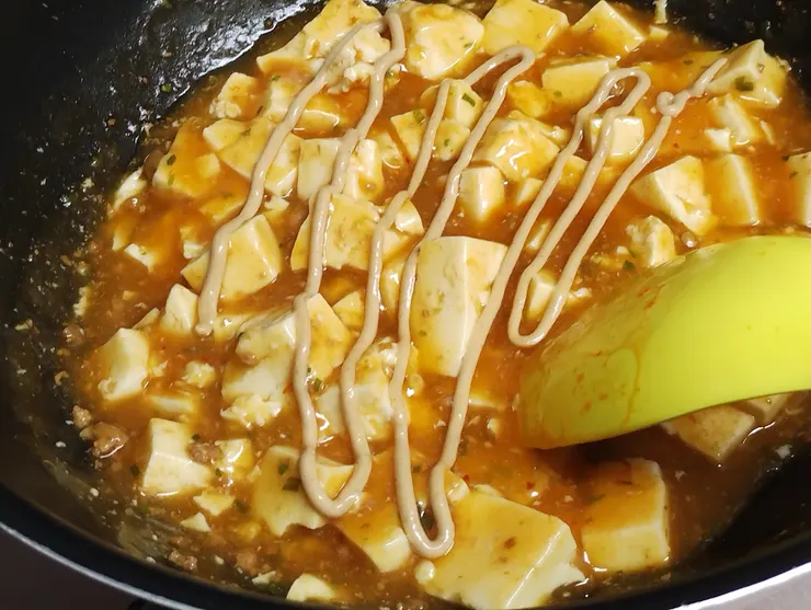 麻婆豆腐の仕上げに世界を味わうマヨしびれ麻辣味を加えました。