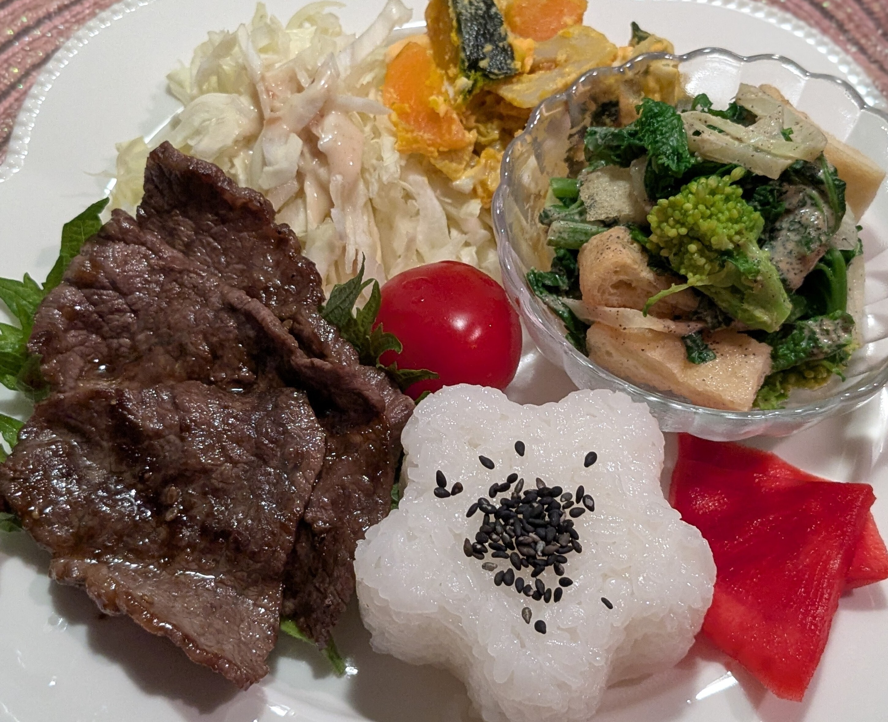 Oneプレートにお肉、サラダ、梅型抜きご飯