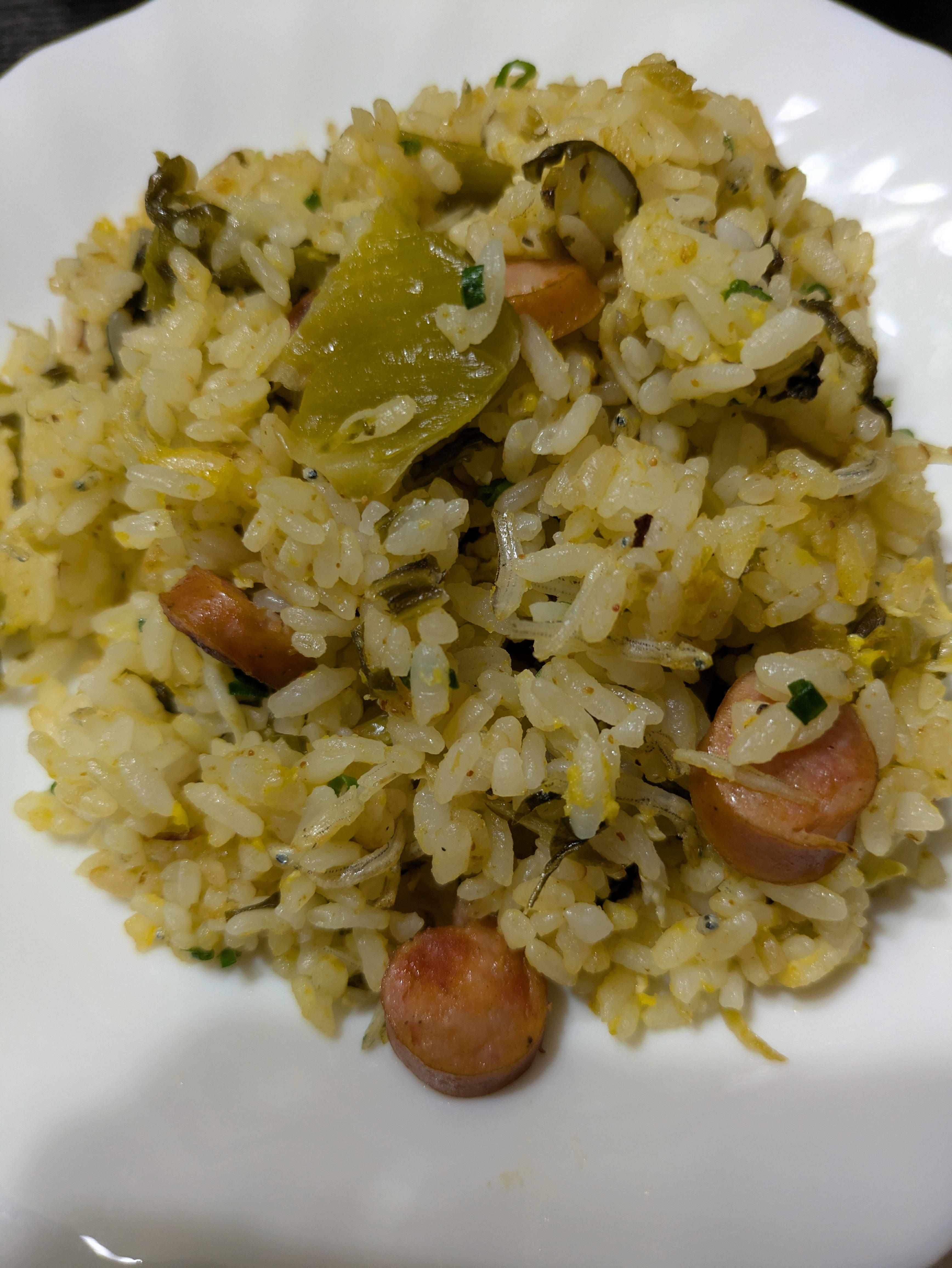 明太からし高菜とちりめんじゃことたまごにマヨネーズ入りとチョリソーと細ねぎの材料で、チャーハンを作りました。