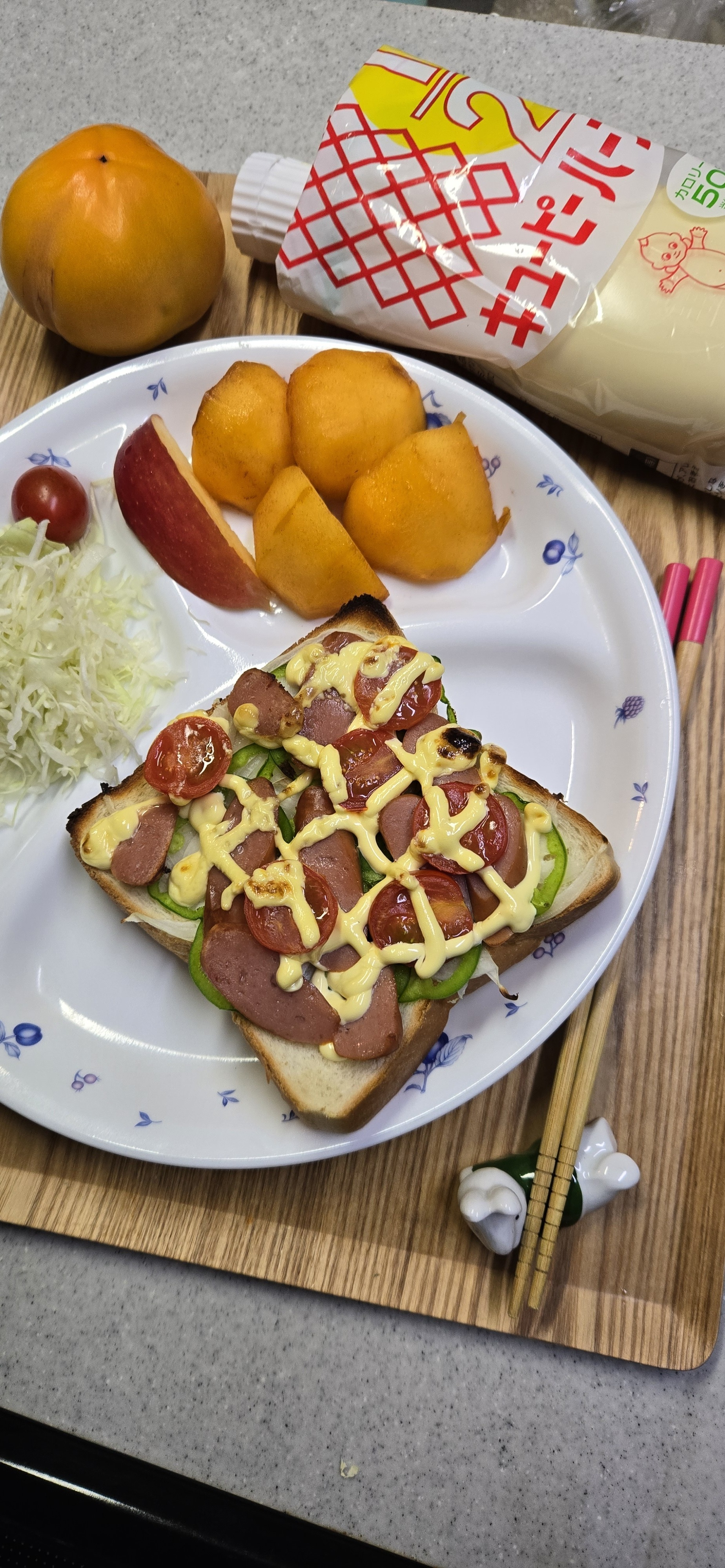 マヨフォトの投稿見て~朝食にウィンナー&🧅オニオンと肉厚なピーマンにたっぷりのキユーピーハーフでマヨトースト出来上がり🎶