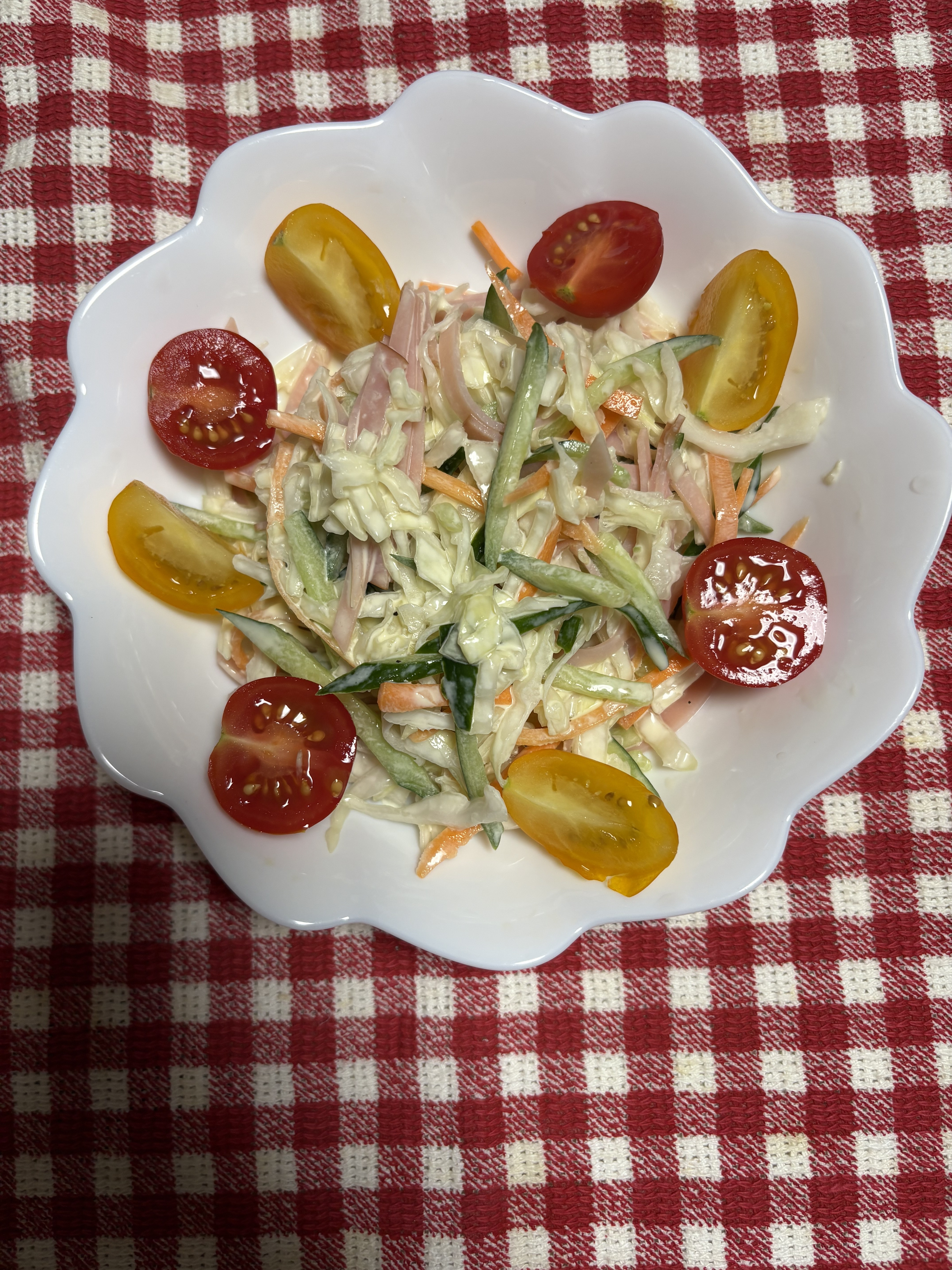投稿を表示かわいいミニトマトちゃんが飾られたコールスローサラダ美味しそうですね