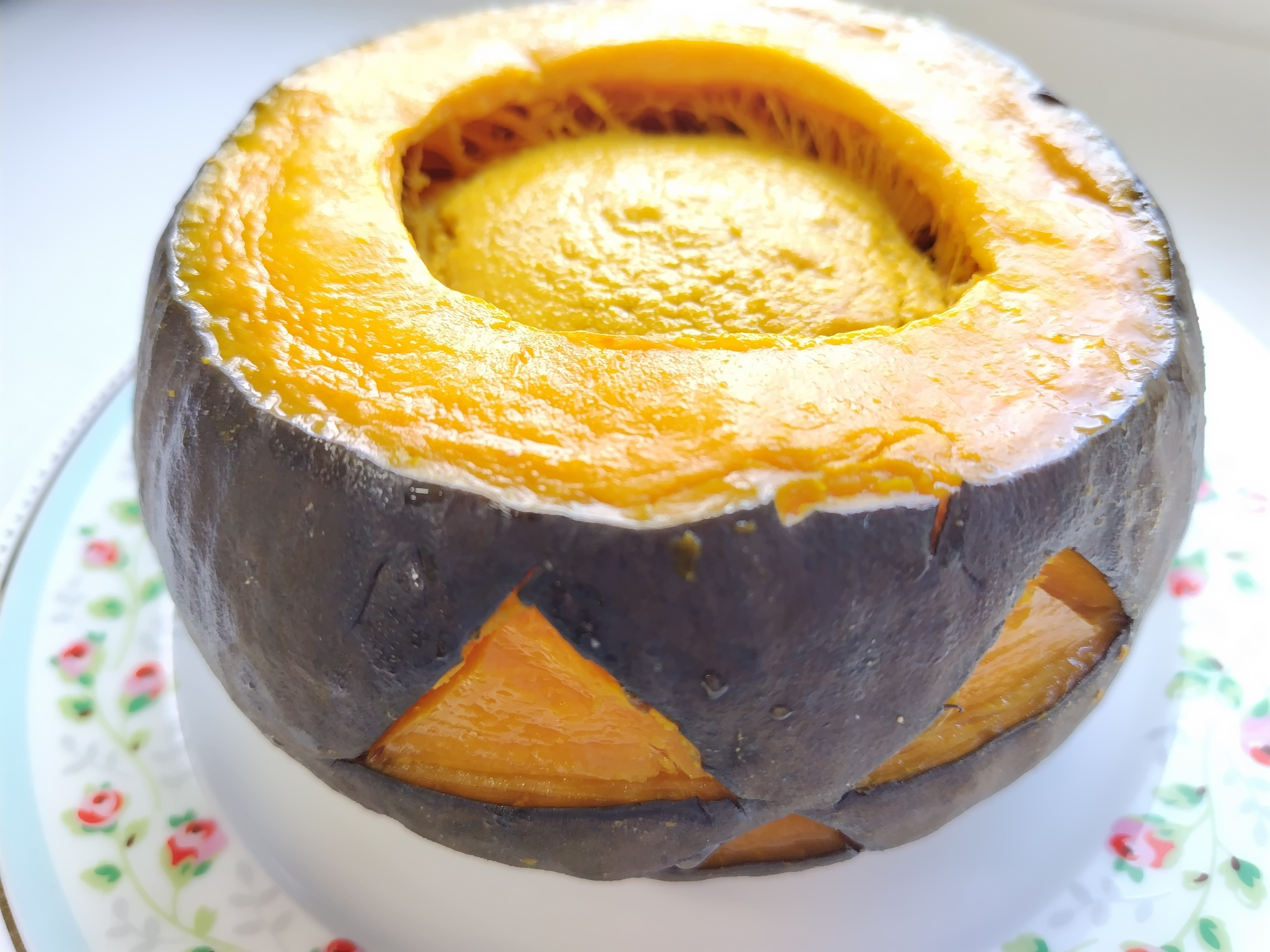 カボチャ🎃レンチンして、上部切り取り、綿と種を取り除き、上部の果肉•卵•豆乳•きび砂糖•マヨネーズも加え混ぜ濾して本体に入れて天板にお湯を張りオーブンで焼いて昨日夜から冷やしました。