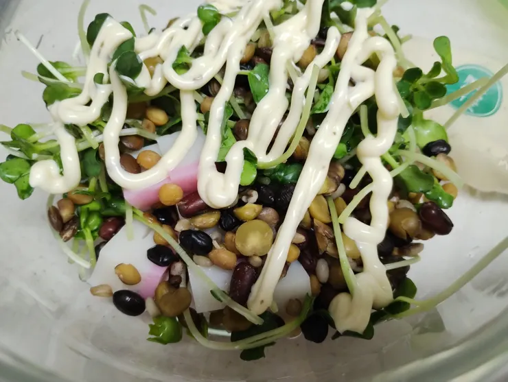 ●カイワレ大根とかまぼこ、サラダクラブさんの10種ミックス(豆と穀物) を世界を味わうマヨ コク深アイオリ味で和えました。