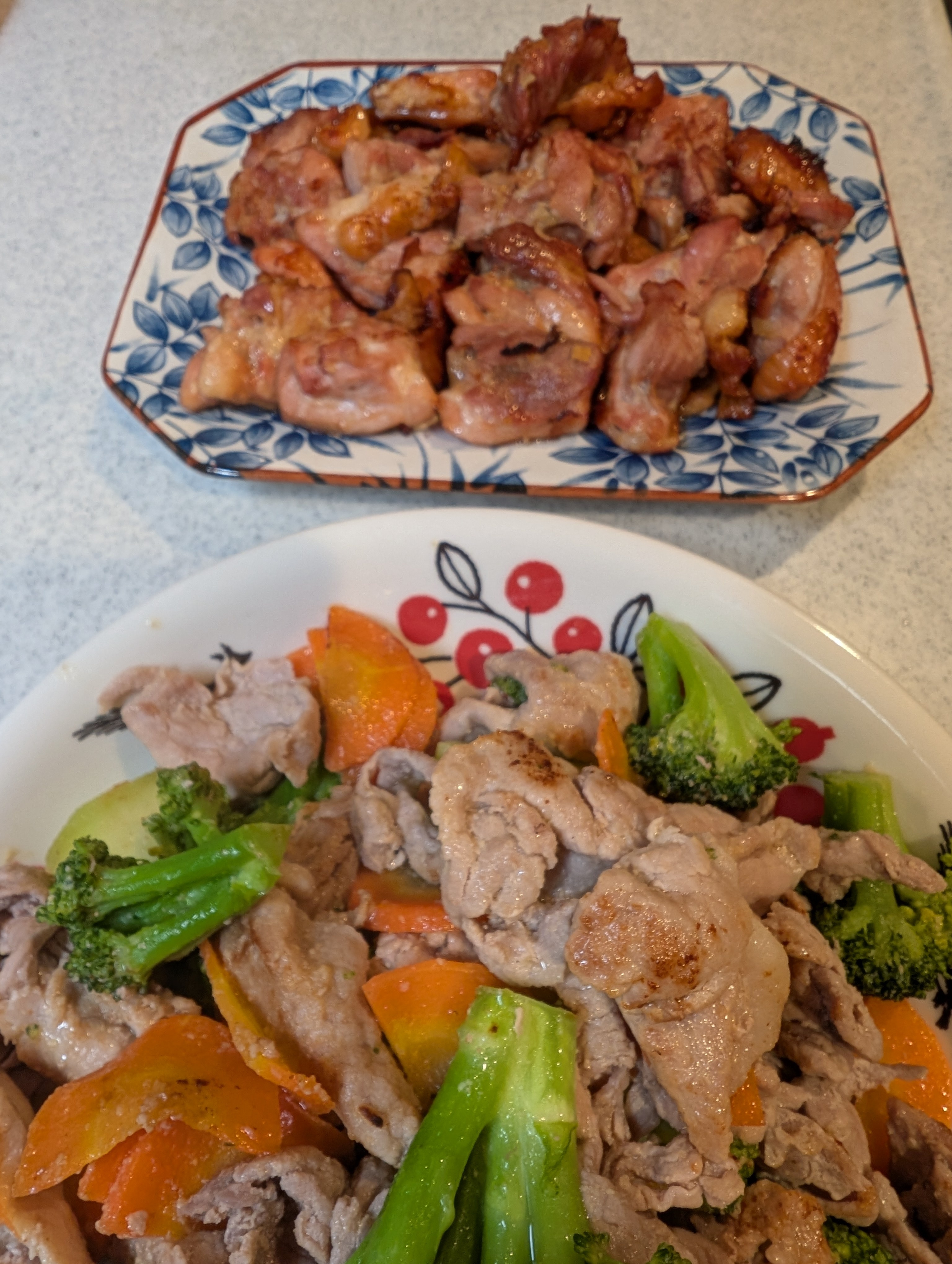 豚🐷とブロッコリー🥦、人参🥕のマヨ味噌󠄀炒め 焼き鶏🤤