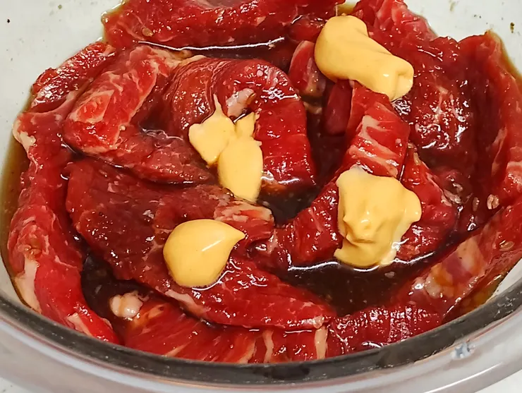 焼き肉のお肉の漬け込みに世界マヨ 旨辛シラチャ―味を加えました。