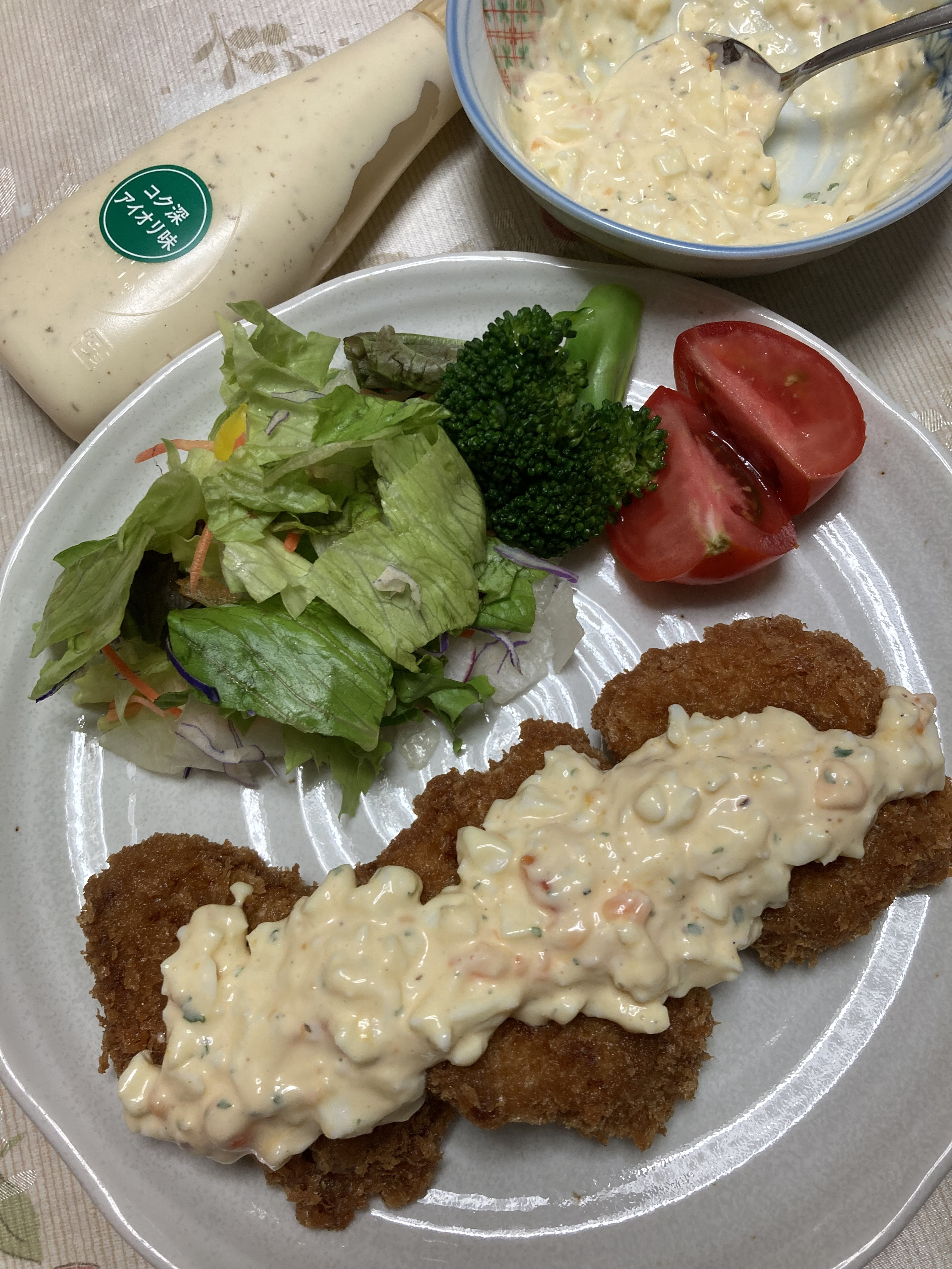 ひれカツを揚げ、タルタルソースをたっぷりかけました。