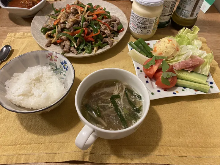 ついでにこの日と翌日の晩ご飯、貼っておきます。青椒肉絲と鶏カシュー炒め、ポテサラは連日登場です。