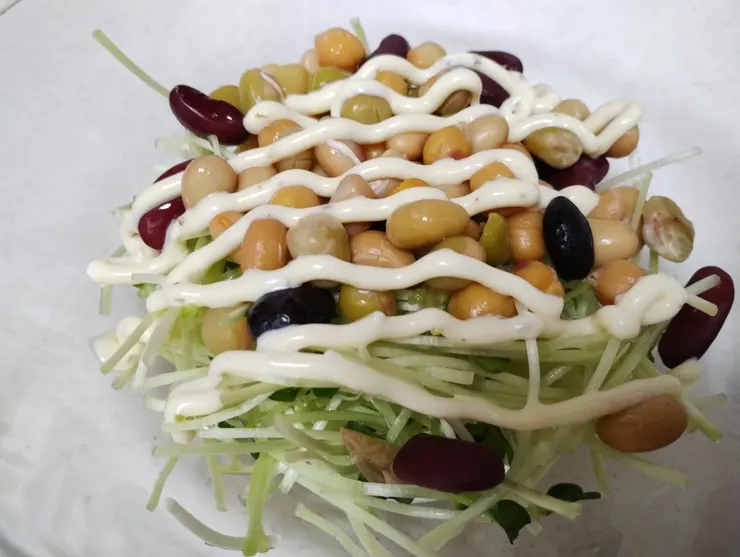 ミックスビーンズとカイワレ大根を世界を味わうマヨ コク深アイオリ味で和えました🌈