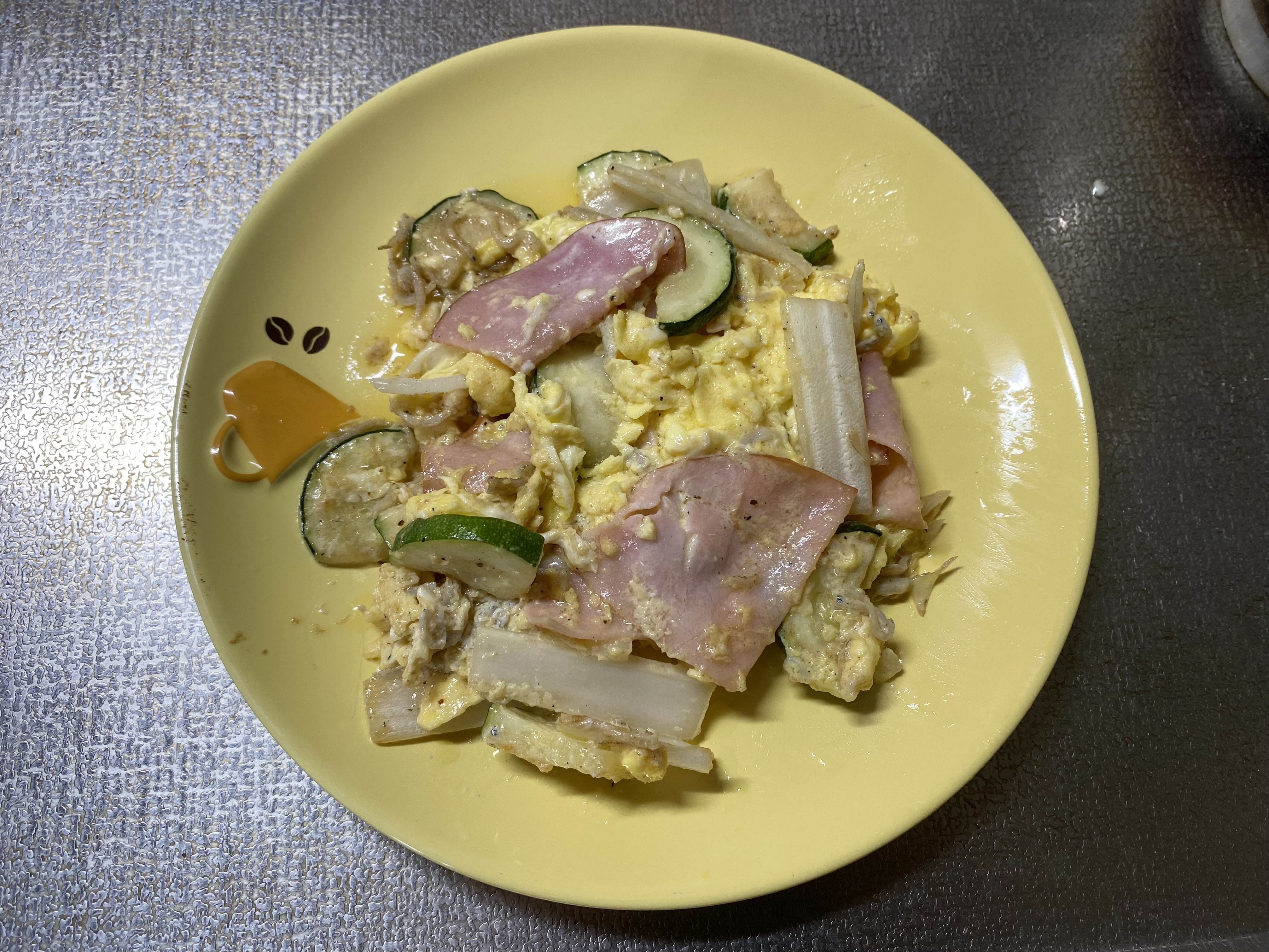おかずに、白菜とズッキーニのマヨソテーを作りました。マヨネーズ入りのスクランブルエッグ、ハム、しらす干しを入れました。絵面きれいでなくてすみません🙏