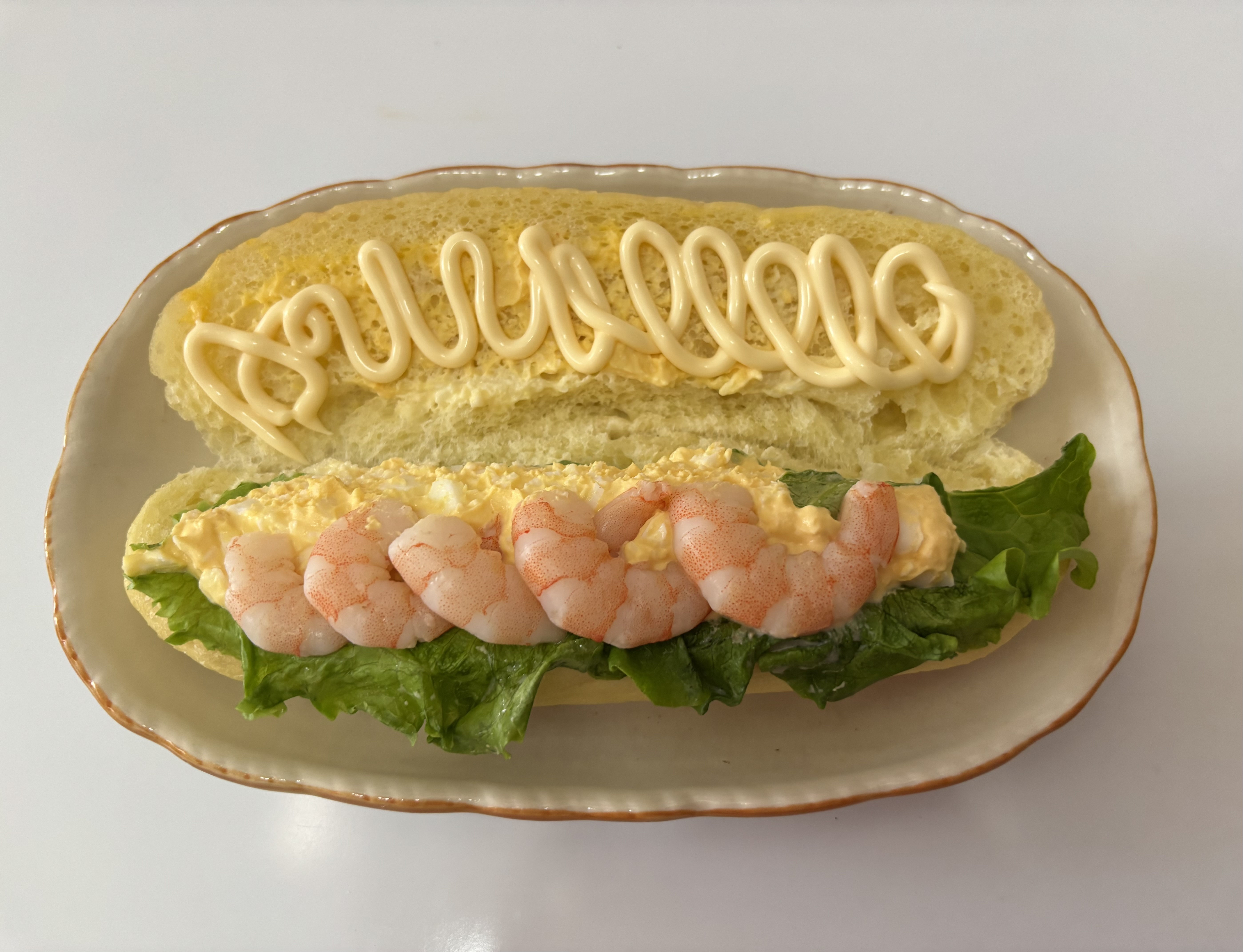 投稿を表示たまごのコッペパンにエビが乗っていて豪華でとても美味しそうです😀💕