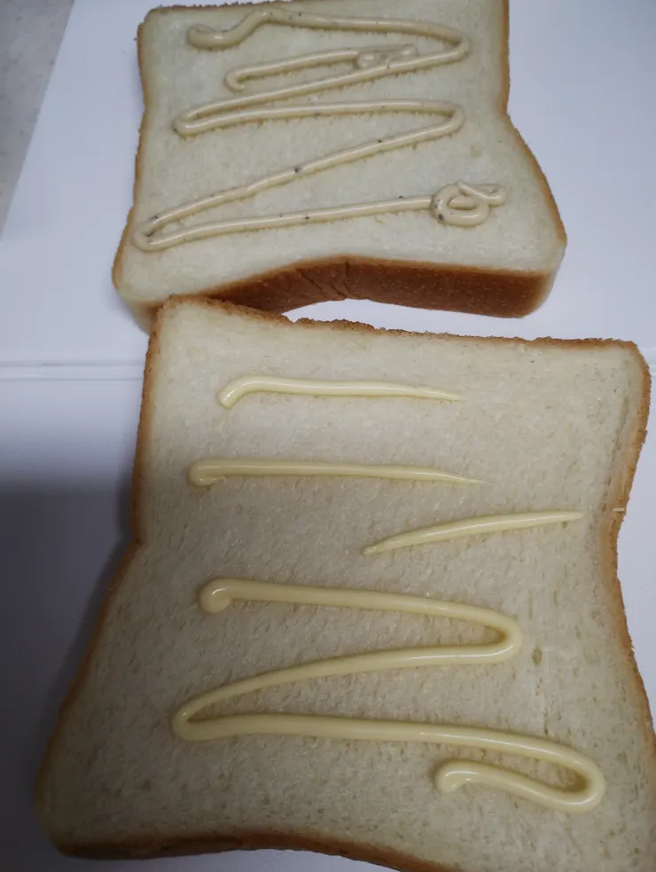 パンの片面にマヨネーズ、もう一方に世界を味わうマヨ 芳醇トリュフ味を塗りました。