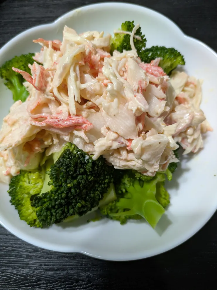 夕飯のサラダにはブロッコリー🥦とオーシャンキング(生食用)にマヨネーズと深煎りごまドレッシングの柚子こしょうを混ぜて和えました。