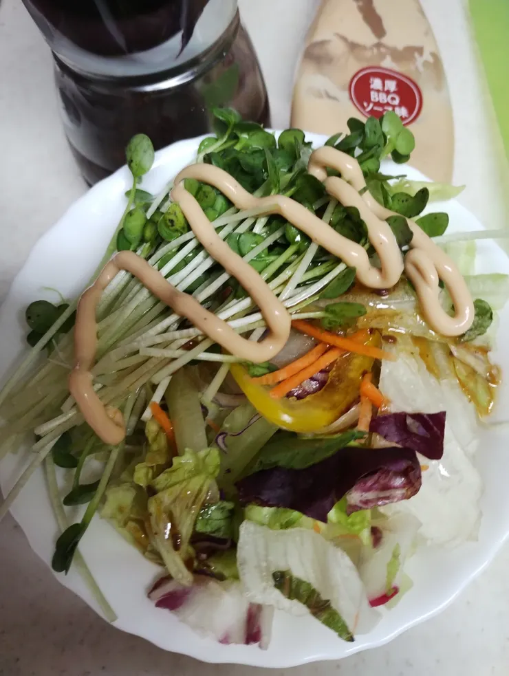 野菜サラダに和風醤油ごま入ドレッシングと世界マヨ 濃厚BBQソース味を掛けて頂きました🌈