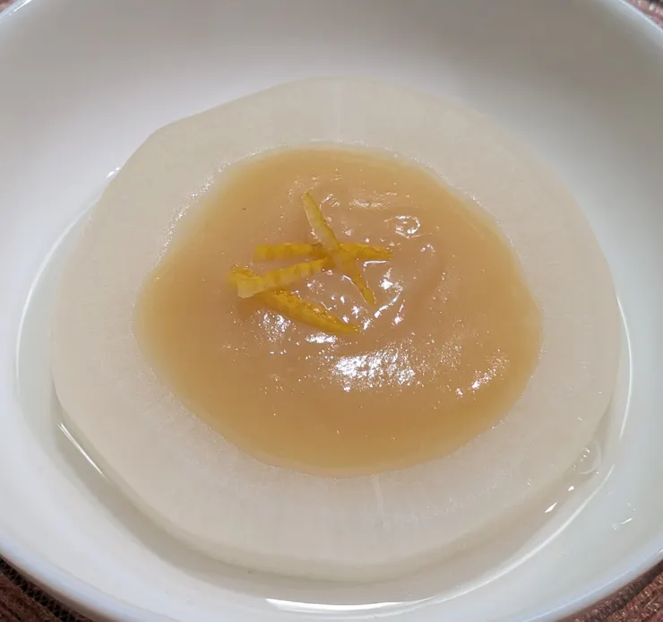 あじまるみ大根のふろふきとても柔らかそうで柚子味噌にマヨプラスもおいしいですね