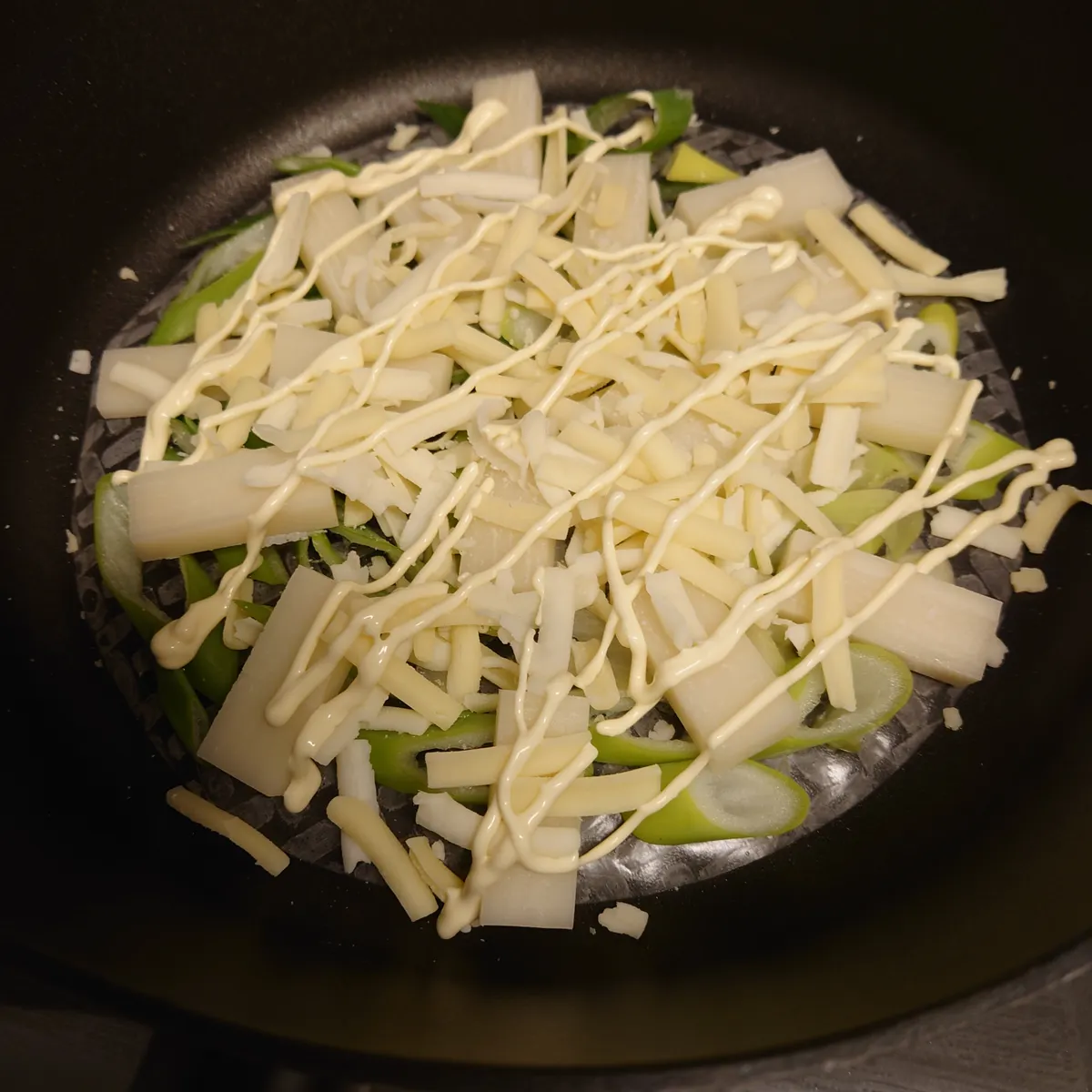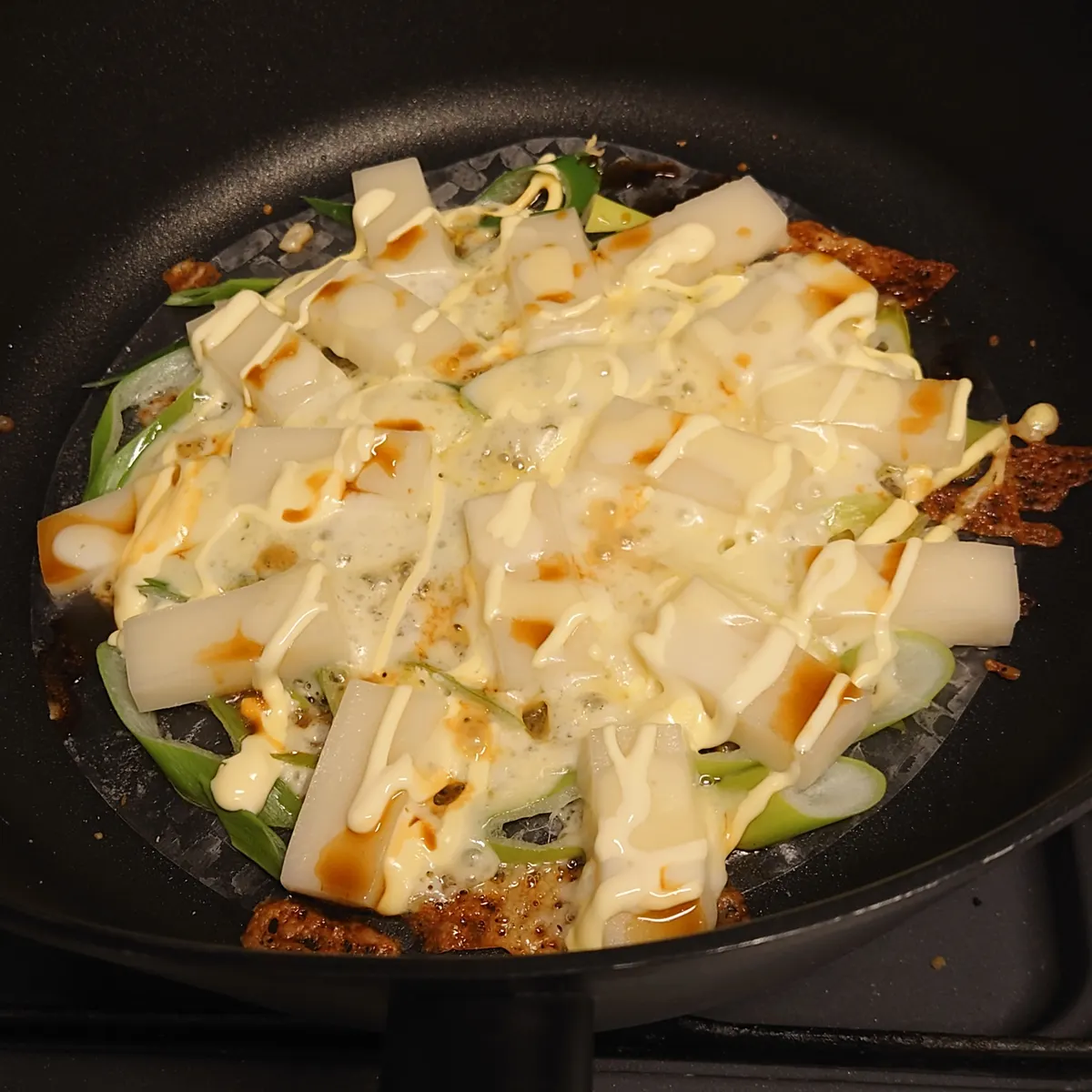 チーズとマヨをかけて焼き、焼き上がってからお醤油を少しかけて頂きまーす😋