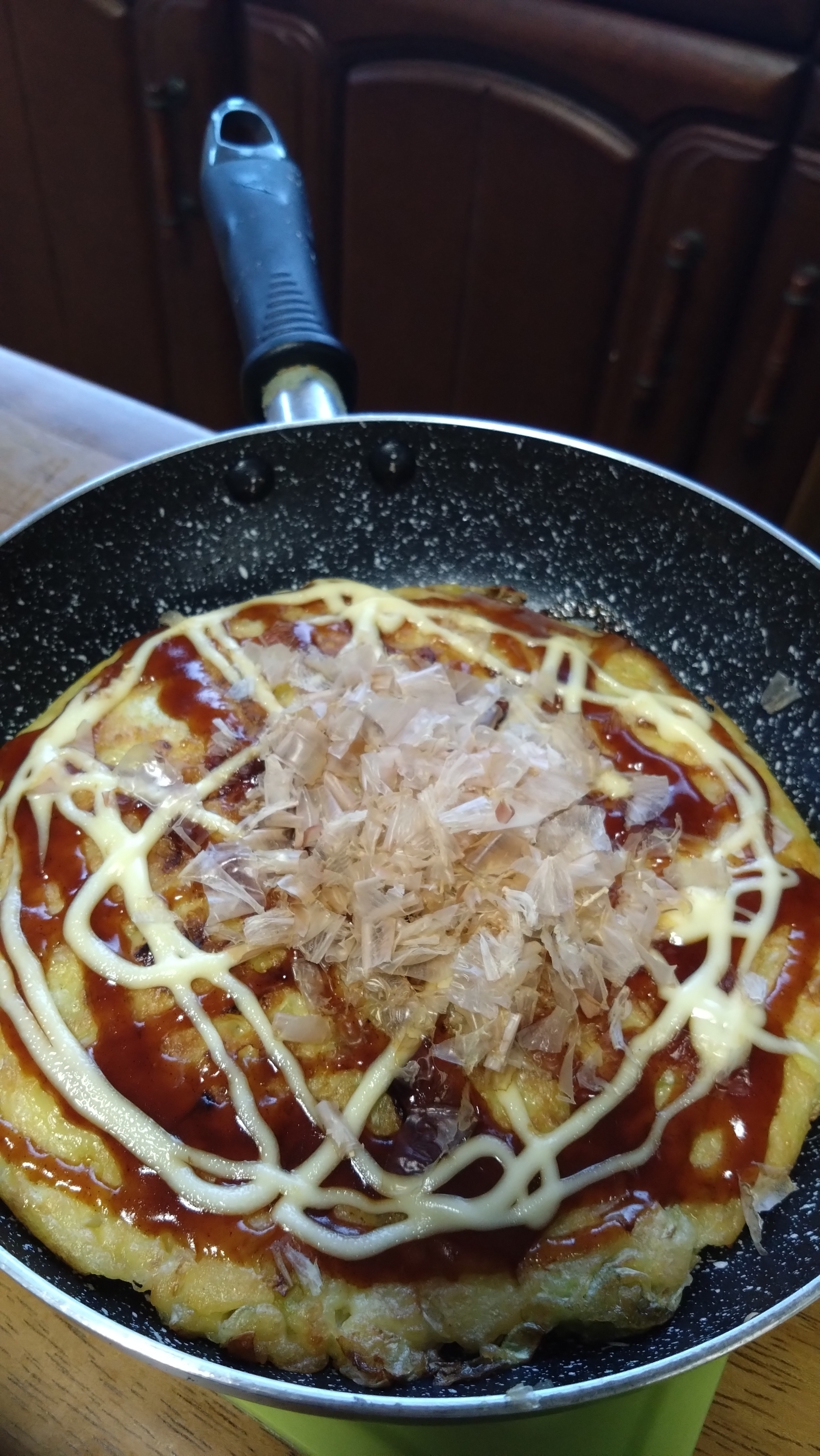 投稿を表示フライパンにピッタリサイズのお好み焼き、美味しそうですね🤤そうそう、削り節にマヨネーズ、必須です‼️