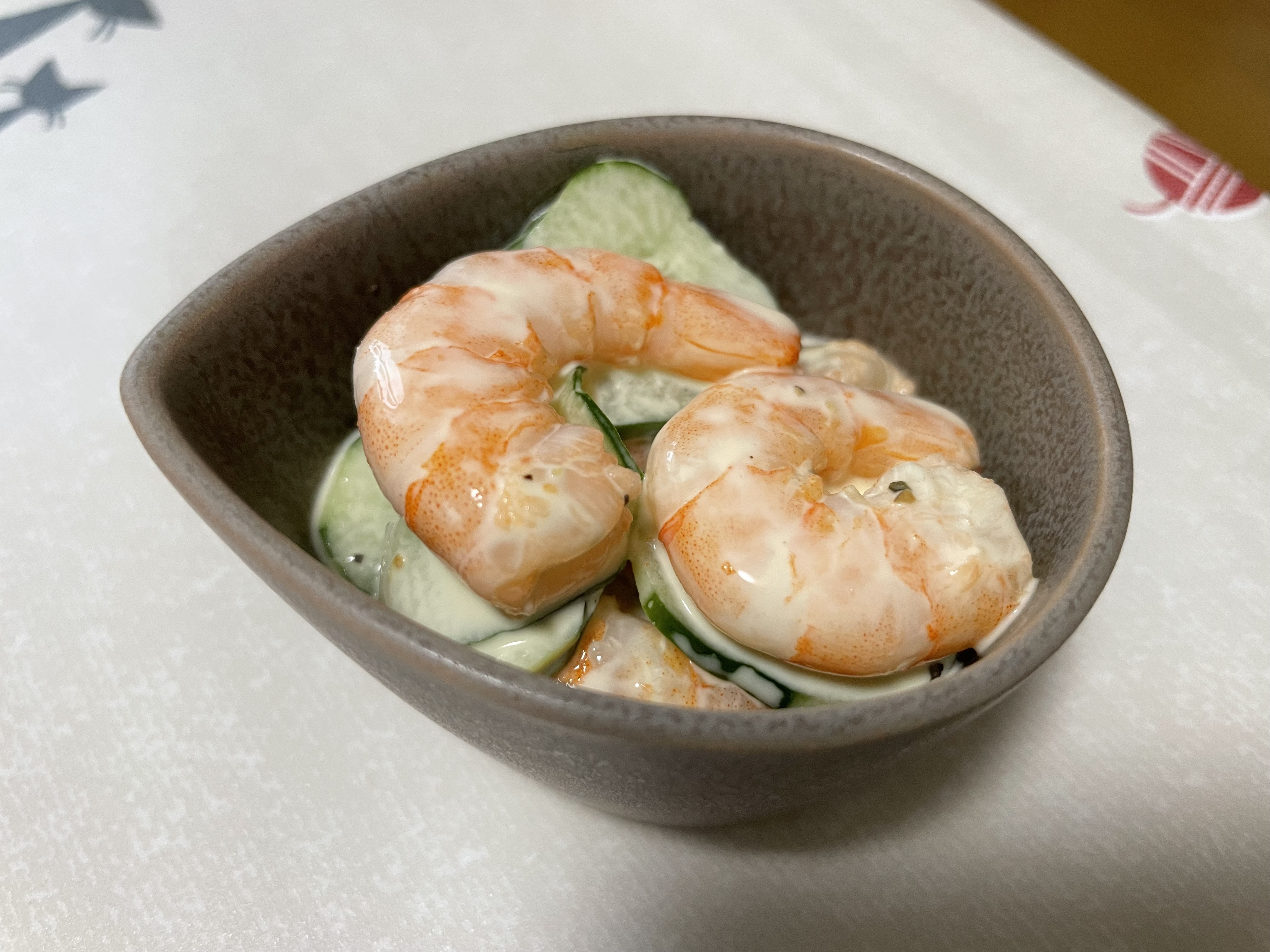 きゅうりを薄切りにして塩揉みして水気を絞ってからエビとマヨネーズ、塩胡椒を混ぜてみました🦐🥒
