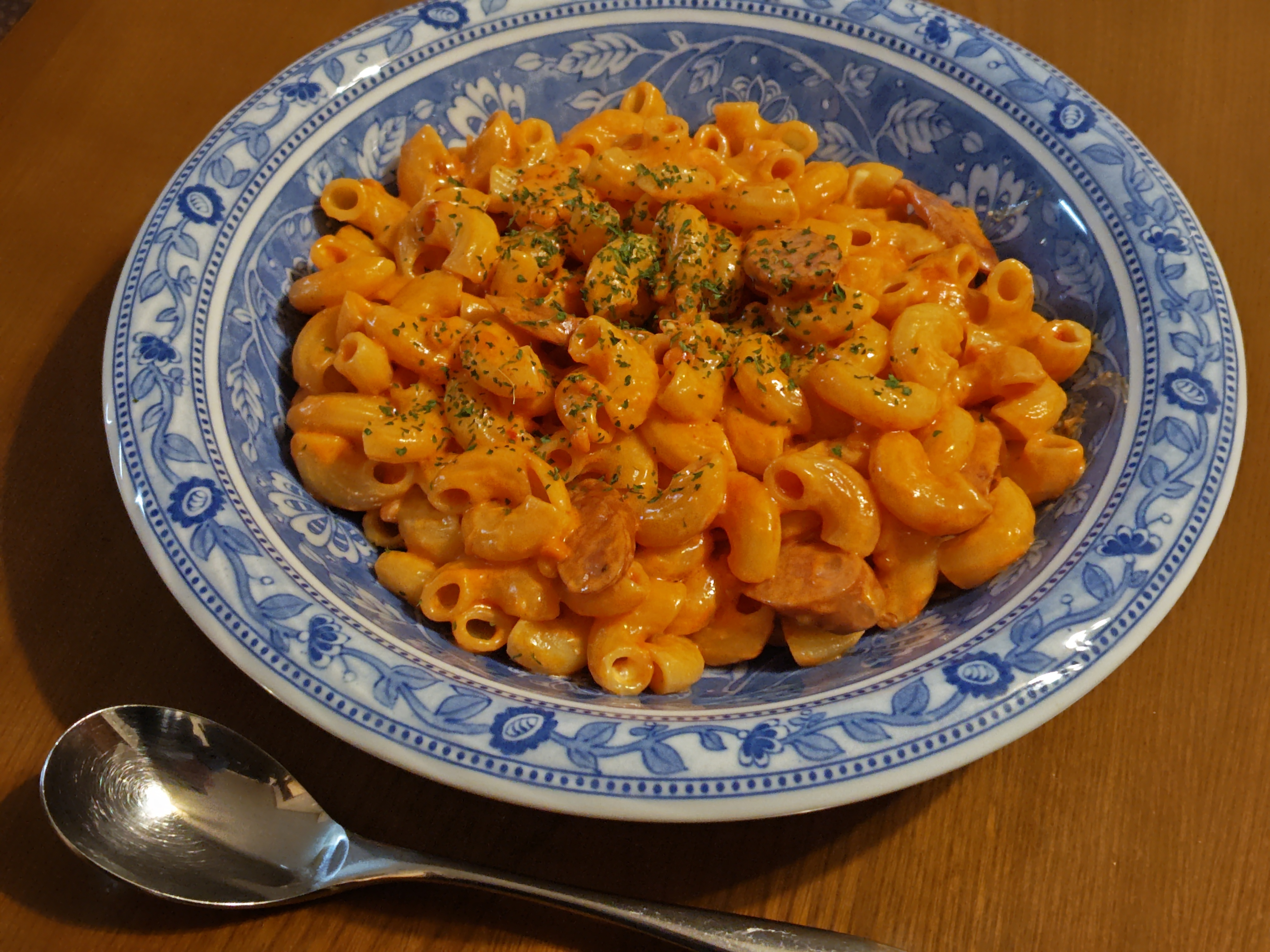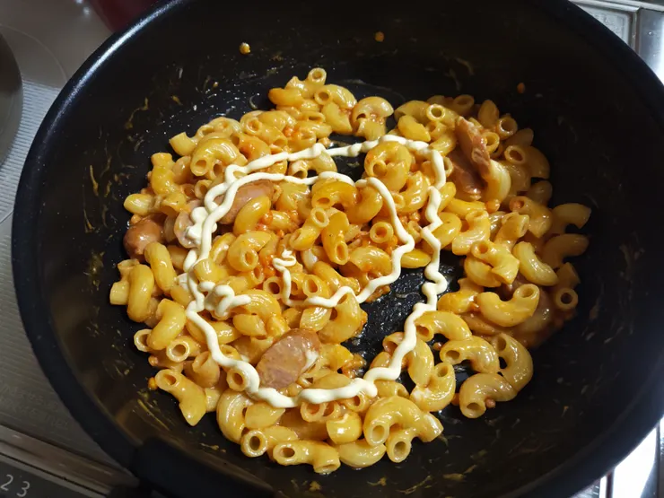 固めに茹でたマカロニとソーセージをマヨネーズで炒め、塩コショウ、トマトペースト、チーズを混ぜました。マヨ多目。