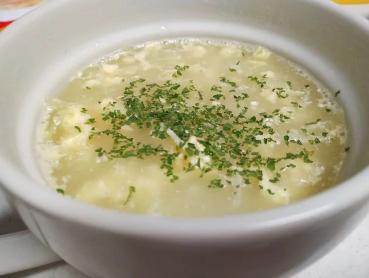コンソメ味のキャベツスープに たまごにキユーピーハーフを混ぜ合わせ流し入れました