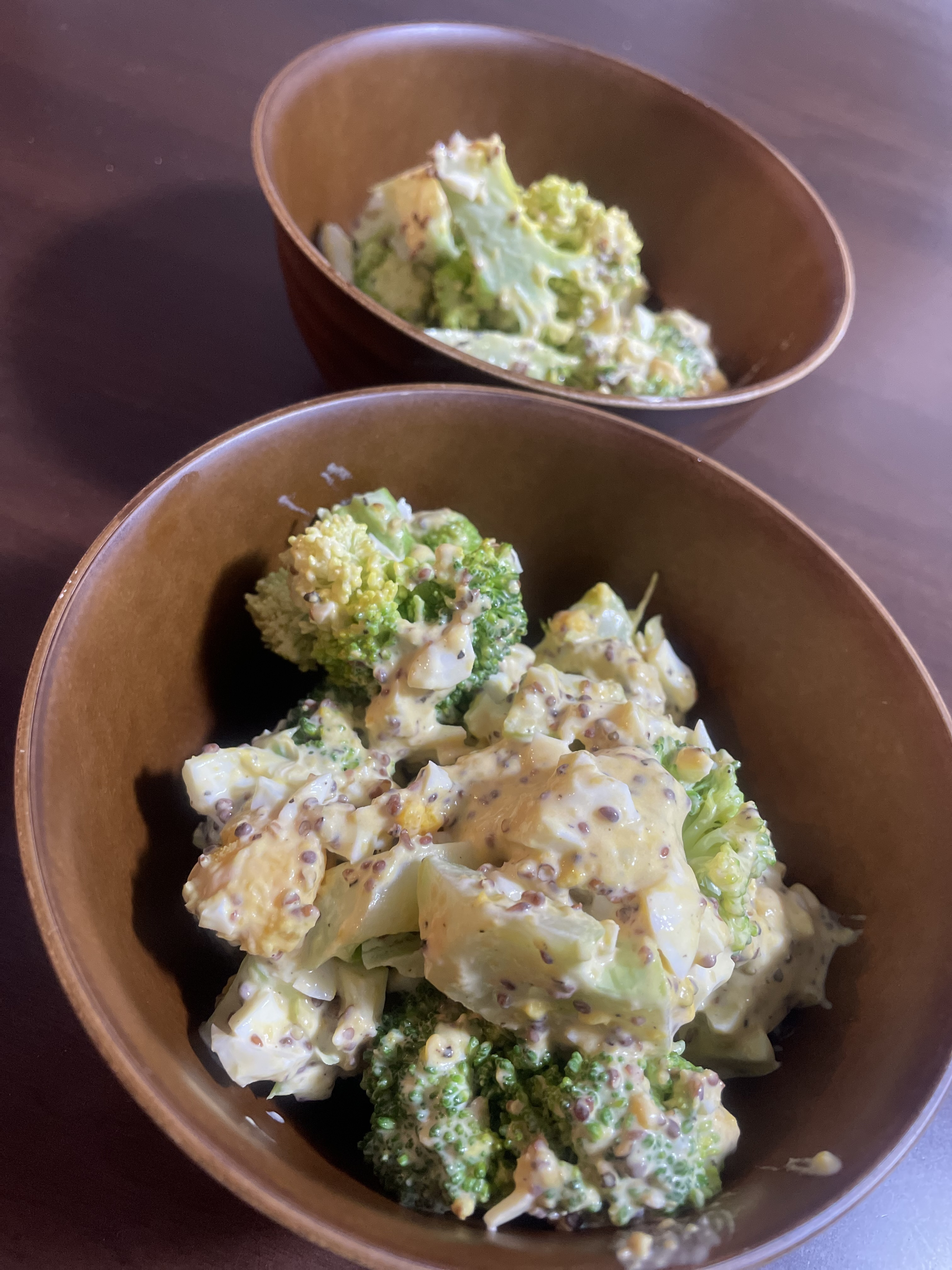 主人が大好きで朝にレンチンしたブロッコリーに潰したゆで卵、粒マスタード、粗挽き黒胡椒、岩塩、マヨネーズで和えました。