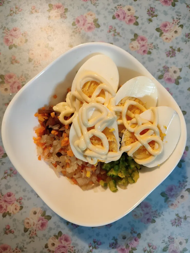 ✨特製?!タルタルは…(らっきょうを漬けたあとの去年のらっきょう酢+醤油に漬けた)皮付き大根のお漬け物・らっきょう・人参🥕・ゴーヤの微塵切り、ゆで卵2個、そしてキユーピーマヨネーズ💛を(写真の量では足りなかったので追加して)混ぜ混ぜ🪄💕