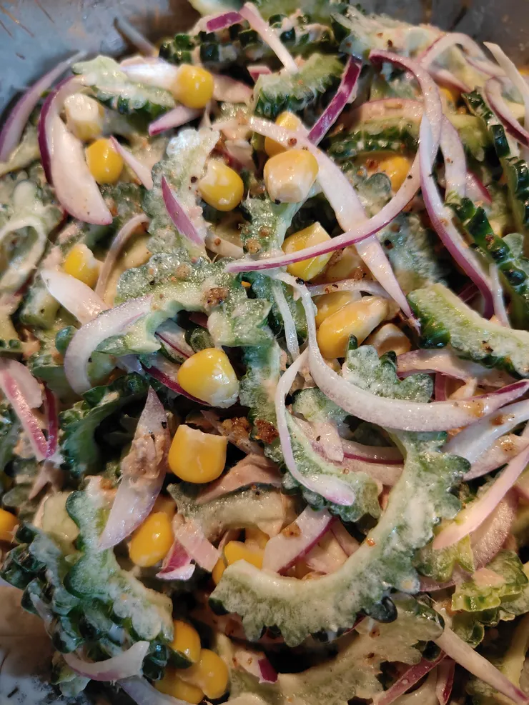 ゴーヤ💚、紫たまねぎ💜、コーン💛、ツナ缶(オイルごと)、✨キユーピーマヨネーズ✨、ニンニクの微塵切り、レモン汁🍋、ミックススパイス…以上!