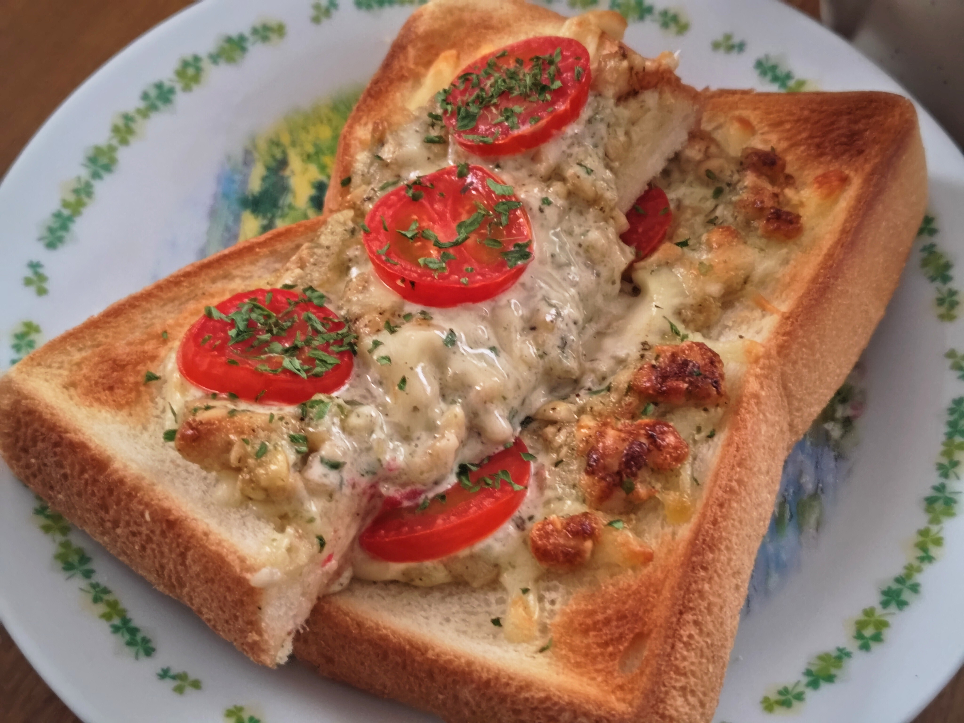 食パンにチーズ、このマヨネーズとトマトをのせてオーブンへ。乾燥パセリを振りかけて完成。