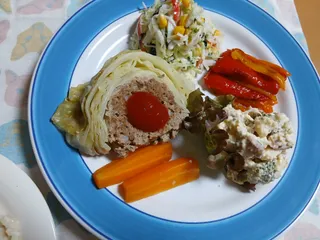 野菜の日プレート 野菜の日プレート(^O^)巻かないロールキャベツ(キャベツ・たまねぎ・にんじん)コールスロー(キャベツ・大葉・コーン・たまねぎ)パプリカのマリネポテトサラダ(じゃがいも・たまねぎ・にんじん・ブロッコリー・レタス)トリュフマヨリゾット(たまねぎ・しめじ)10種類の野菜をいただきました