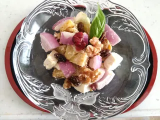 夫がたくさん焼き芋を購入してくれたのでポテトサラダ風に頂きました カットした焼き芋、紫たまねぎ、クリームチーズ、くるみ、レーズン、クランベリー マヨネーズ、塩コショウ、レモンの果汁少々で味付けしました マヨネーズとクリームチーズのコク甘い焼きいもに紫たまねぎの辛味をプラ