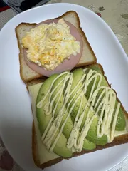オープンサンド 今日のひとりランチに作りました。スライスチーズにアボカド🥑のスライスをトッピングしたのと、ハムにタルタルをトッピングしました。久し振りに三本線のマヨ、使いました😅