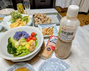温野菜・天ぷら・刺身いただきました♪温野菜にしびれ麻辣味&焙煎胡麻ドレッシングを使いました先日しびれ麻辣味を使いましたが、かなりシビレて今回は焙煎胡麻ドレッシングと混ぜていただきました♪天ぷら(キス・大葉・菊芋・春菊)天ぷらの衣にマヨネーズを混ぜました、サクッと揚がりましたキスの刺身先日マヨスライダ