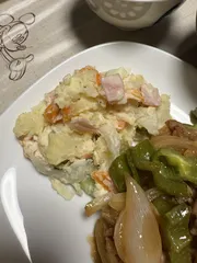 付け合わせにポテトサラダ🥗 市販の味噌漬豚肉を焼いて付け合わせはポテトサラダ🥗にしました。ジャガイモ🥔、人参🥕、キュウリ🥒、玉ねぎ🧅、ハムにマヨたっぷり入れたサラダは我が家の定番です。