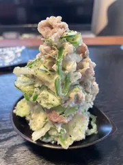ポテサラがタワーになってるヾ(≧▽≦)ノ 具材もネギやバラ肉が入ってる? 私にはない発想で興味津々です!