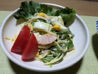 きゅうりの代わりにレタスを刻んでスパサラに😋今夜は鯖の味噌煮、春菊と蒸し鶏のごま和え、シーフードミックスと青梗菜のスープも。