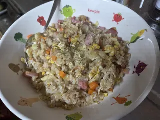 マヨ炒めのチャーハン 疲れてやる気が起きないので、冷蔵庫にあるものでチャーハン。むかし、椎名誠さんの本の中で見たチャーハンの作り方を参考にしています。もちろん油はマヨネーズに変更。具はキャベツ、にんじん、玉ねぎにベーコン。ベーコンは、切り落としベーコンを使っています。「キユーピーとヤサイな仲間たち」のお皿でいただきま~す